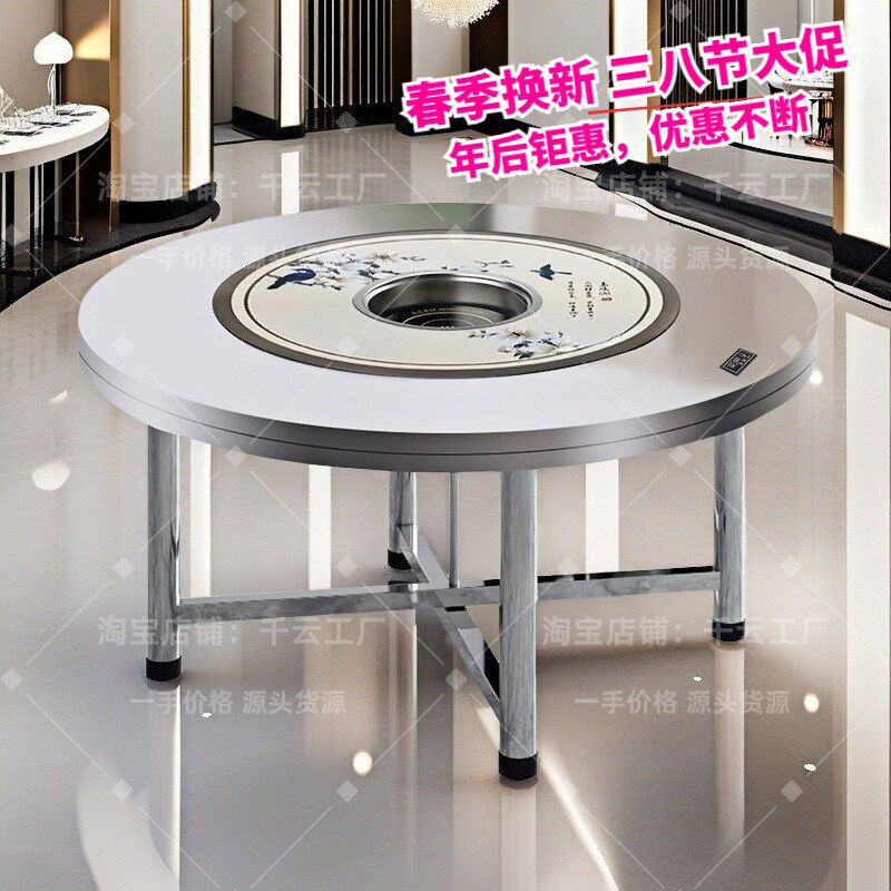 2024新款食堂火锅桌折叠多功能不锈钢转盘圆餐桌饭台饭桌椅套装