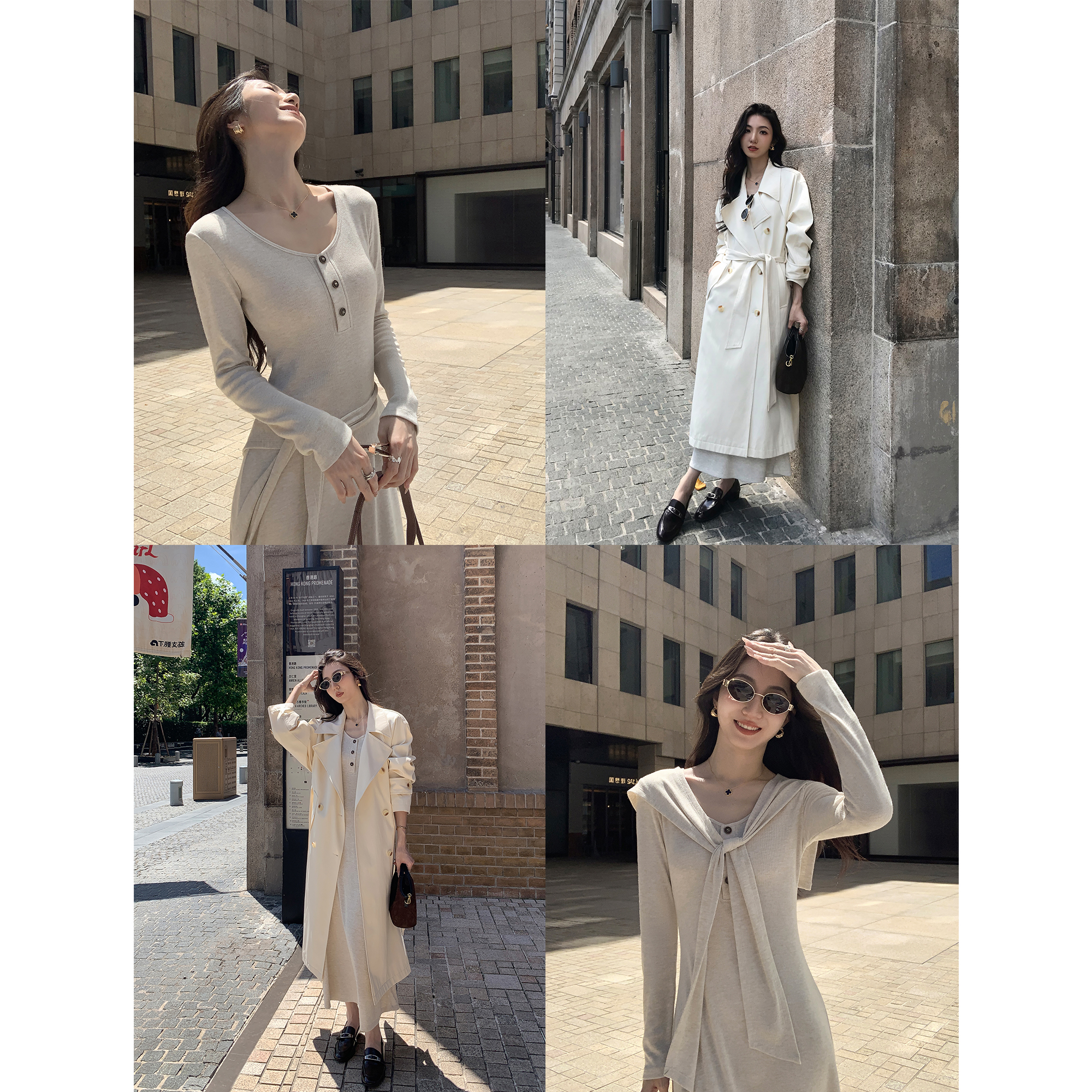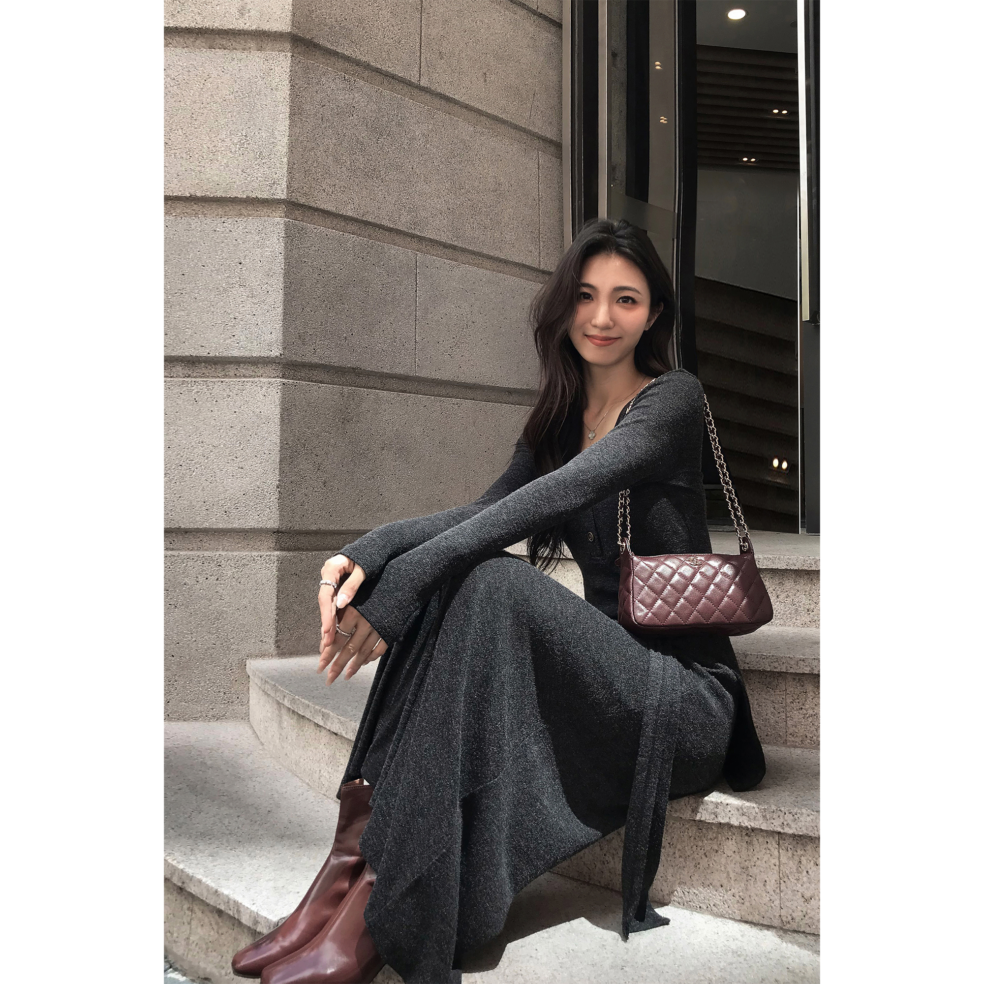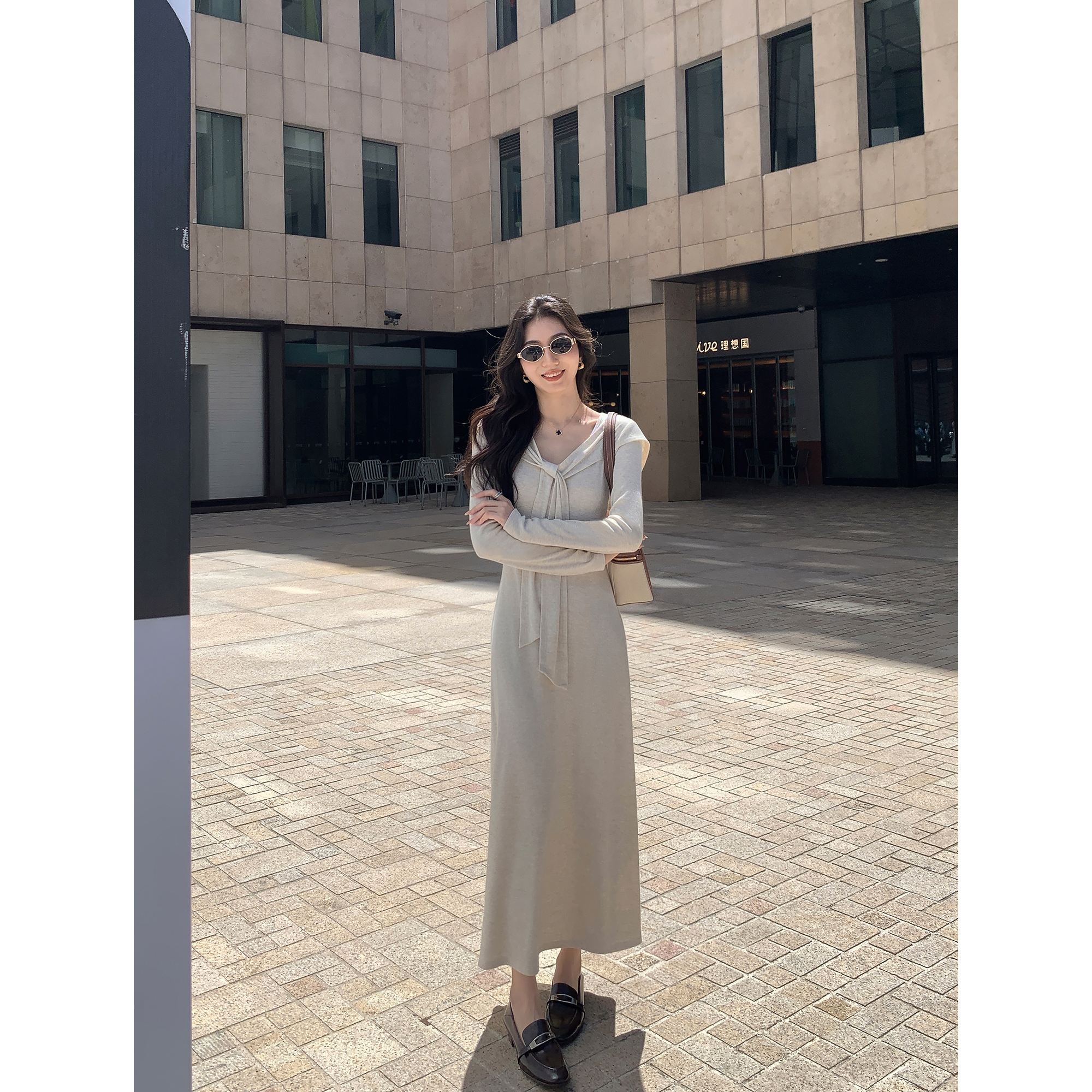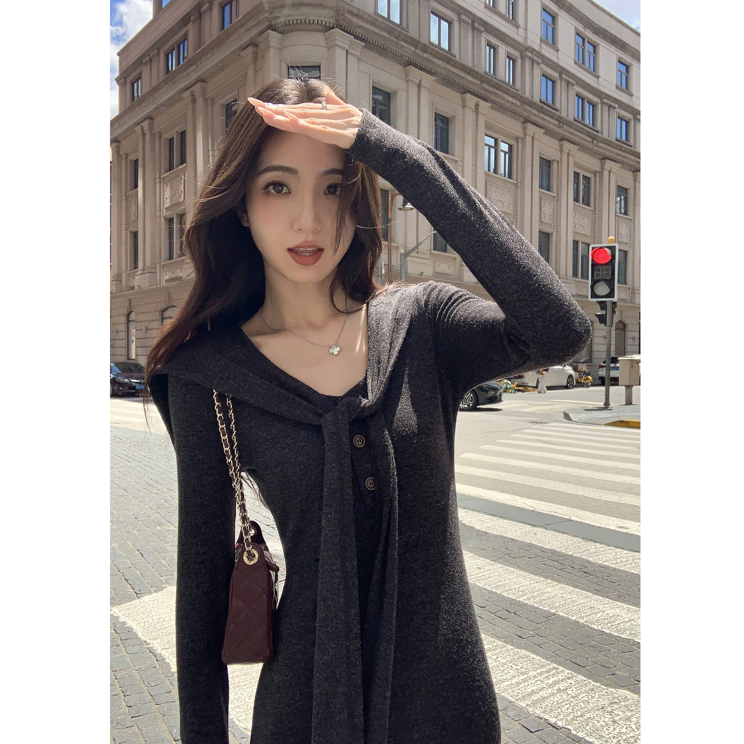 MULVAN 韩系温柔 海军领长袖针织连衣裙女可拆披肩裙子修身两件套