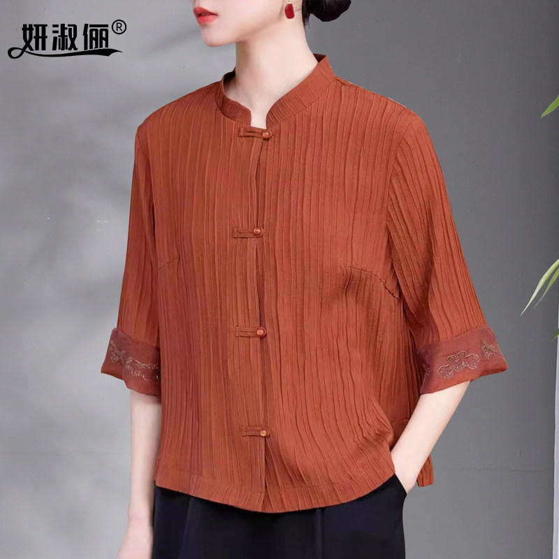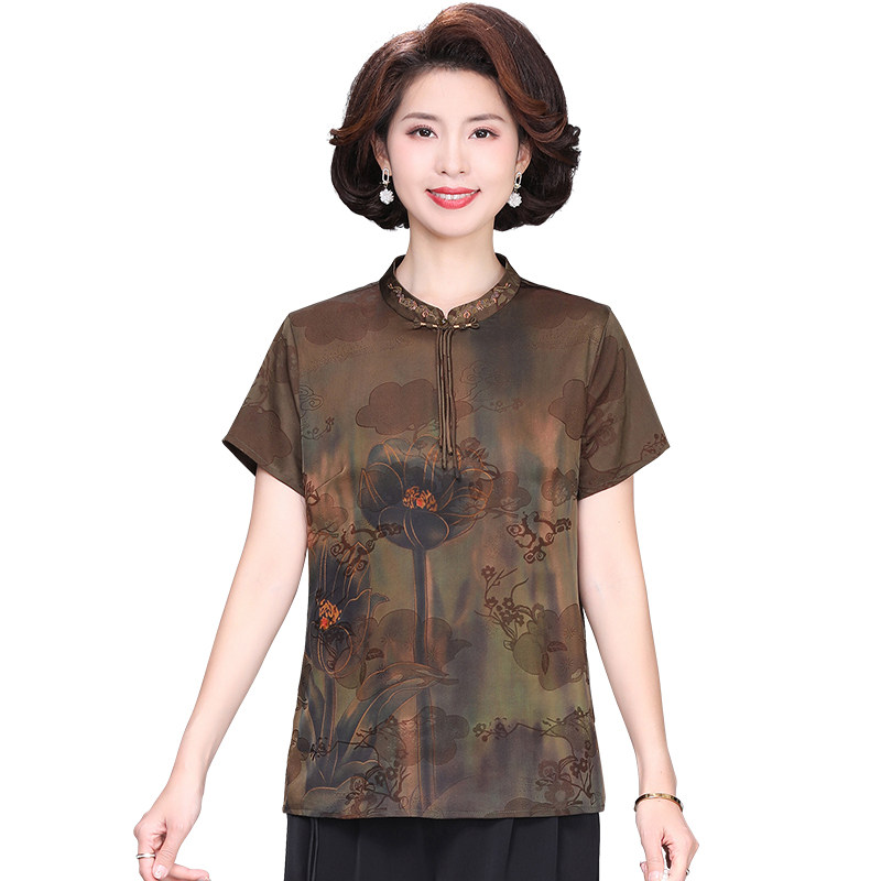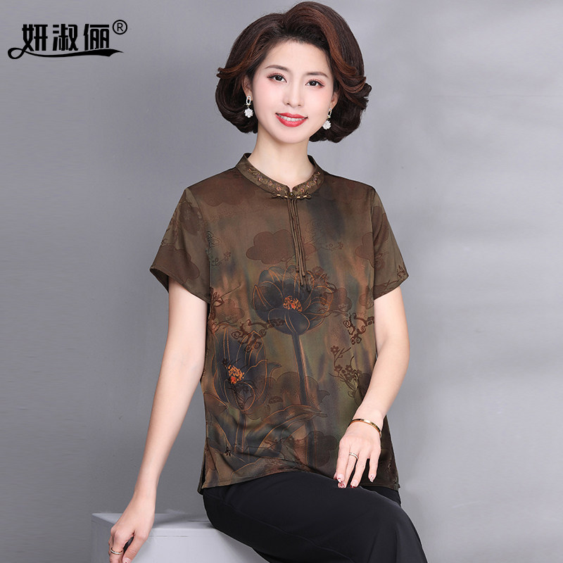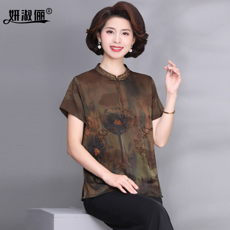 妈妈夏装蚕丝缎上衣2025新款洋气阔太太中老年人衣服香云纱衬衫女
