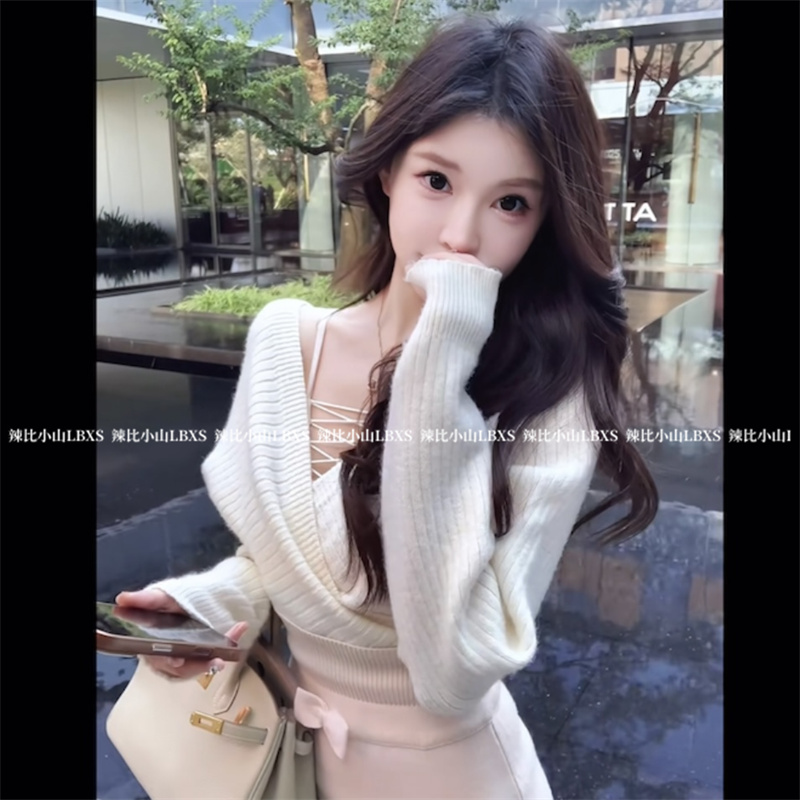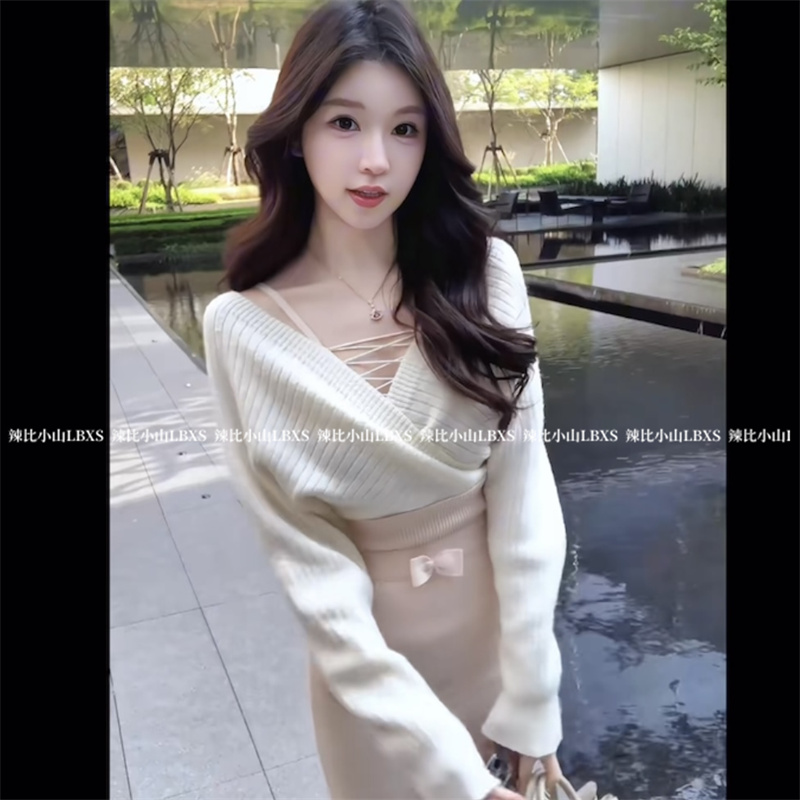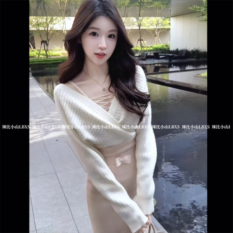 法式气质小香风交叉V领长袖毛衣2025冬高腰针织包臀半身长裙套装