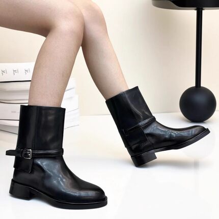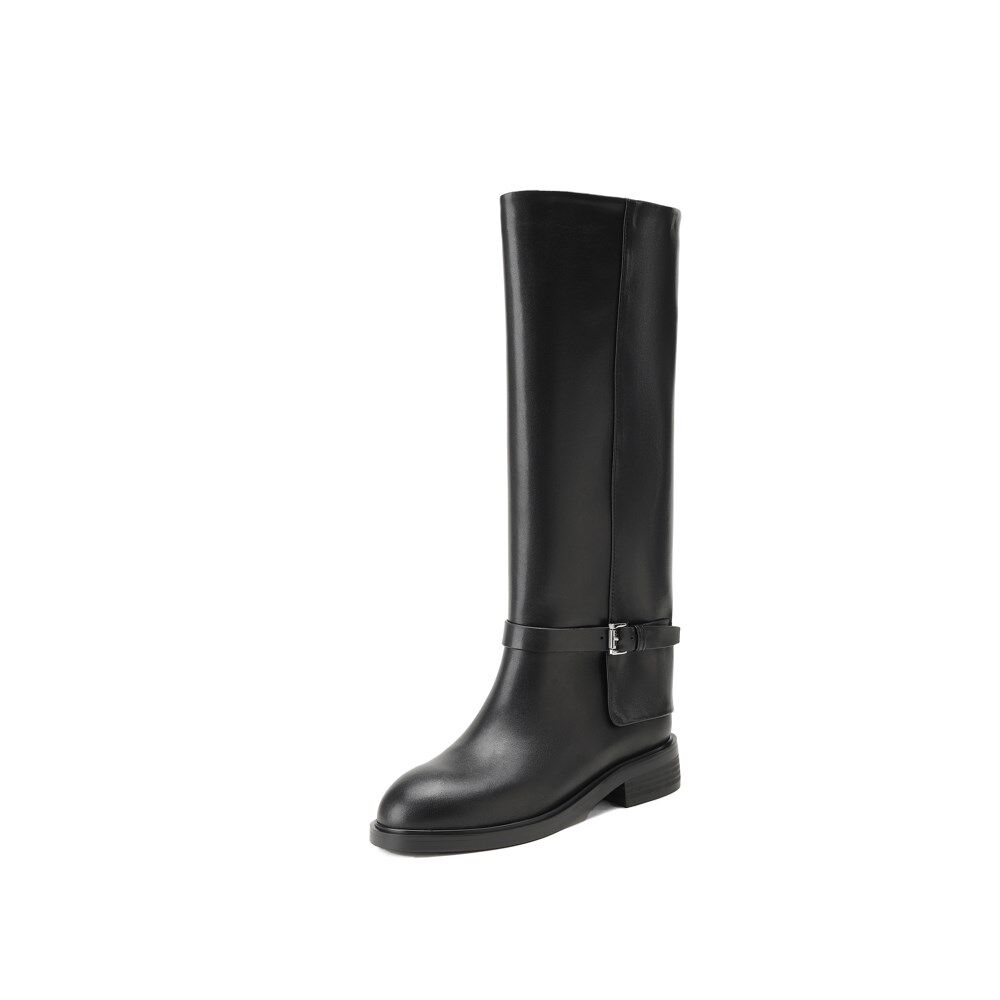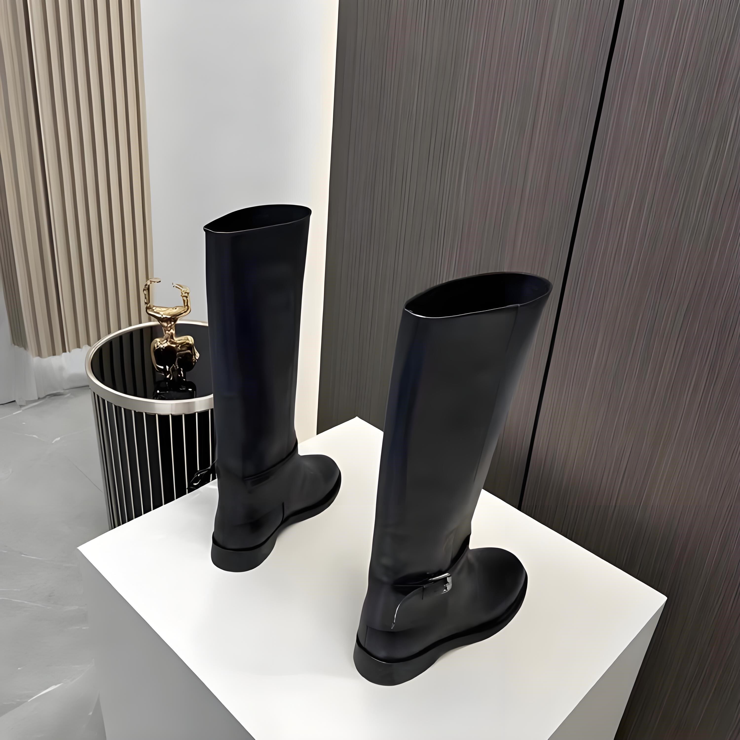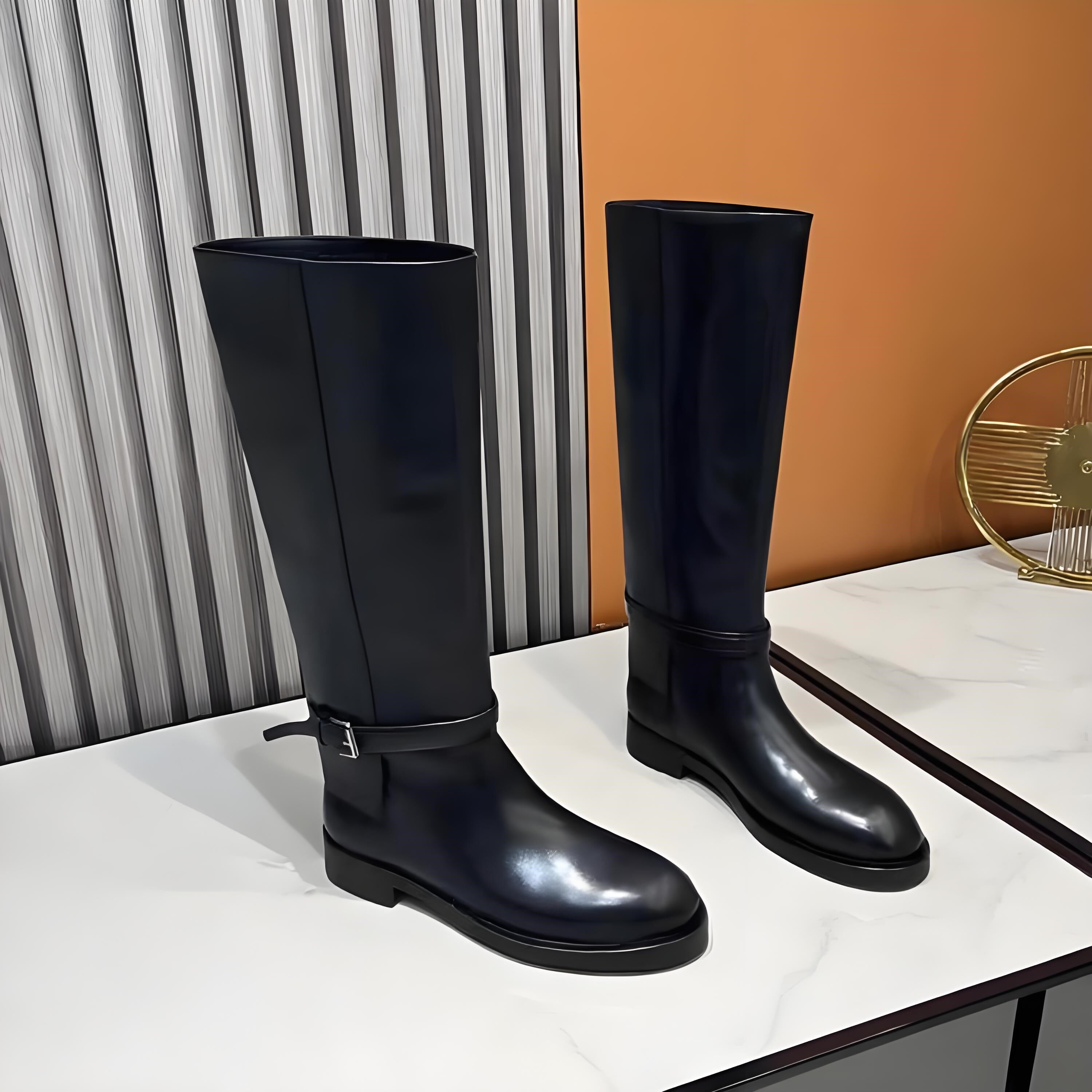 欧洲站全真皮秋冬新款骑士靴复古长靴美拉德高筒平底不过膝直筒靴