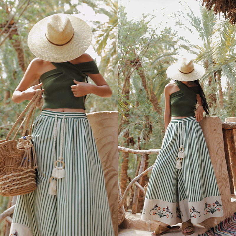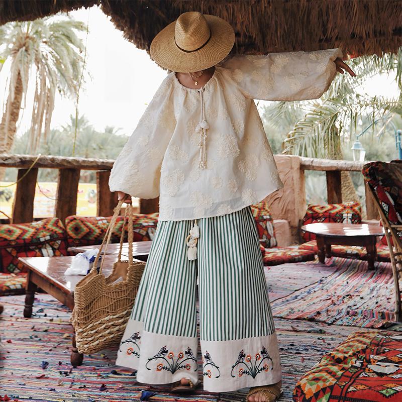 麦叙《海滨假日》波西米亚度假风条纹绣花宽松阔腿裤高腰系带长裤