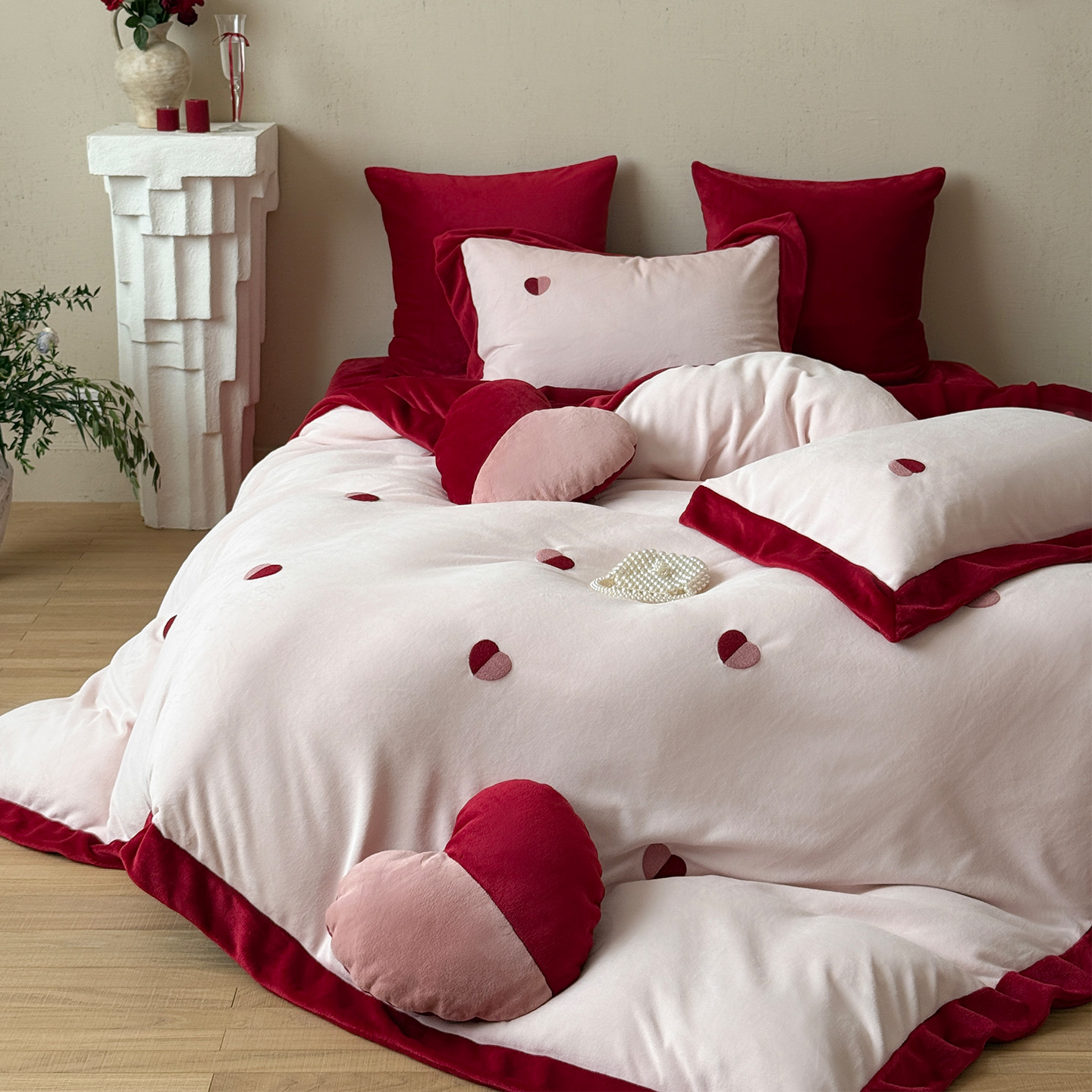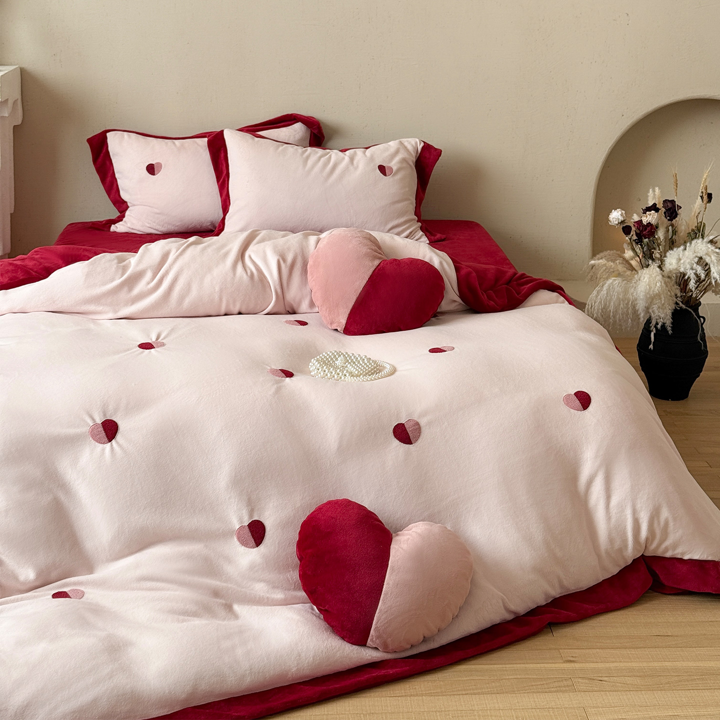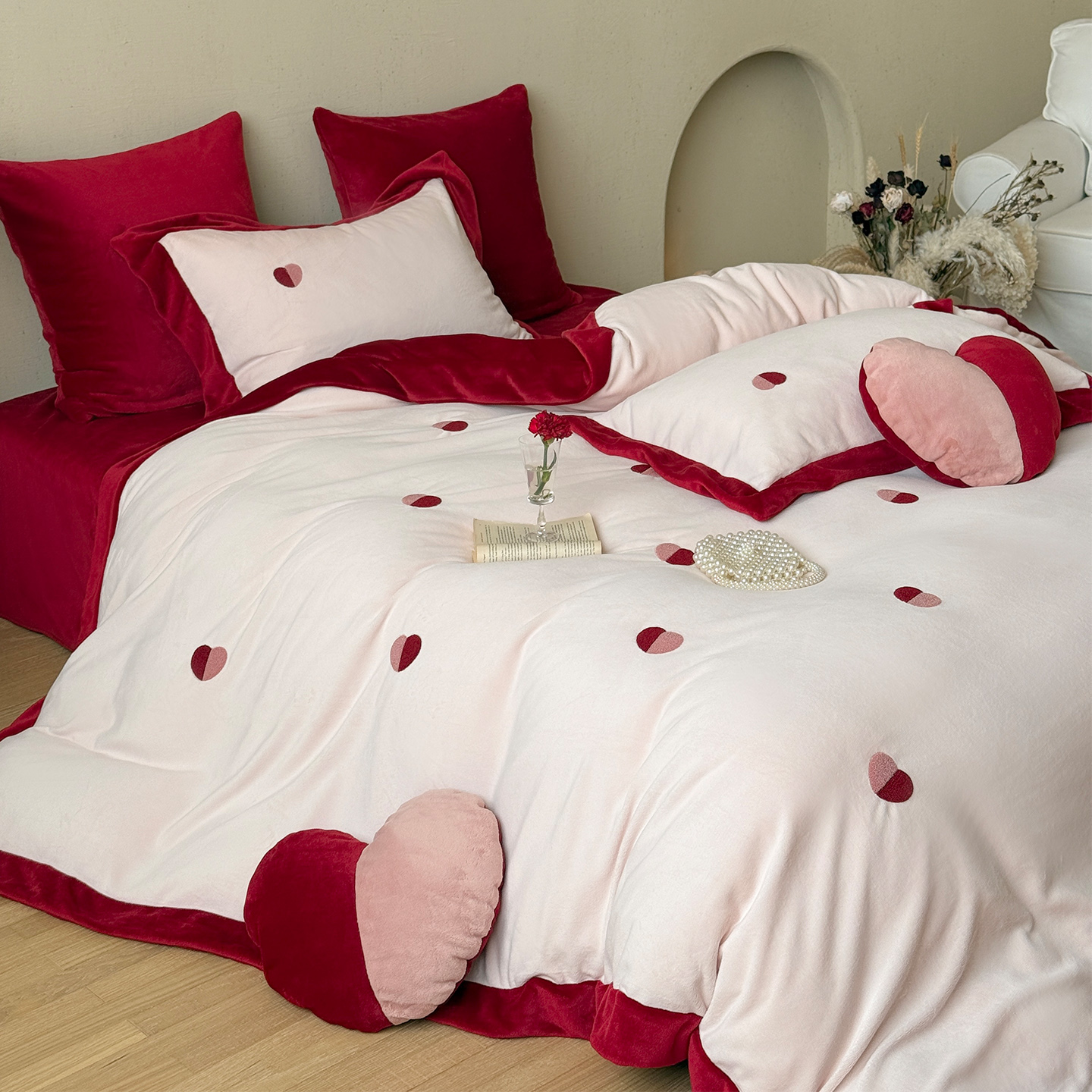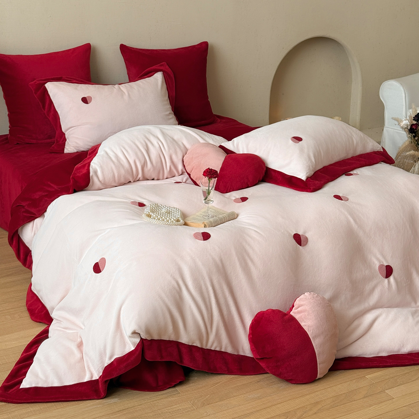 LANSWAY心相印韩风牛奶绒婚庆四件套冬季保暖红色结婚被套床单盖