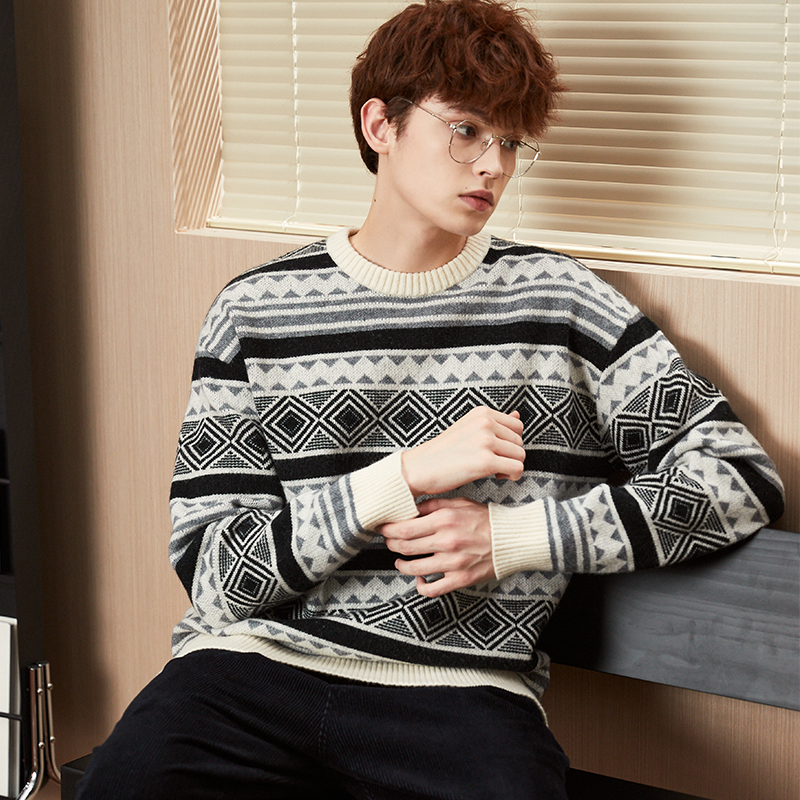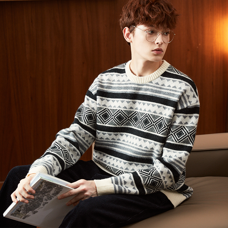 唐狮毛衣男生冬季新复古潮流满身花几何费尔岛男毛衫加厚潮流