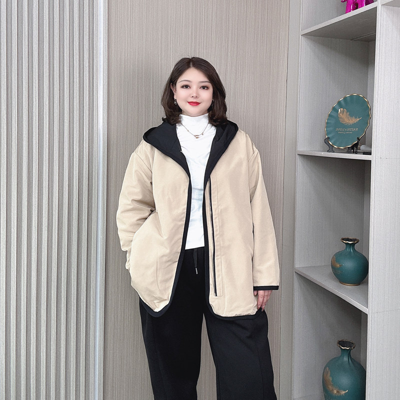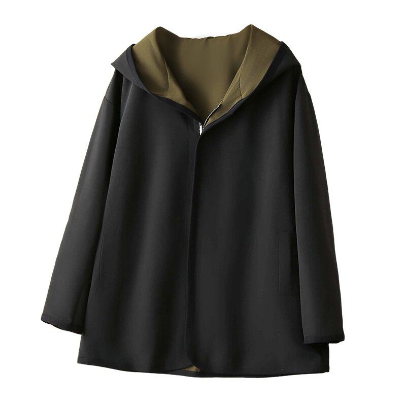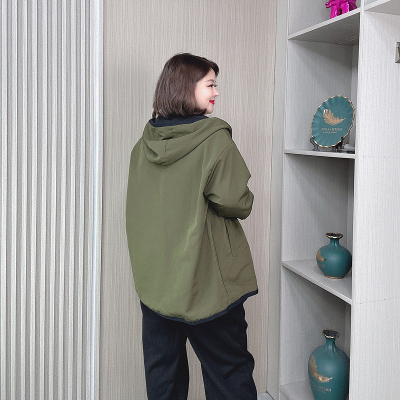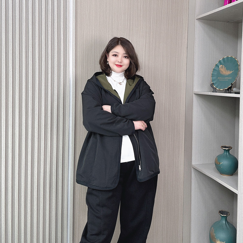 春秋连帽拉链中长款外套女装大码胖mm宽松时尚双面穿休闲风衣开衫