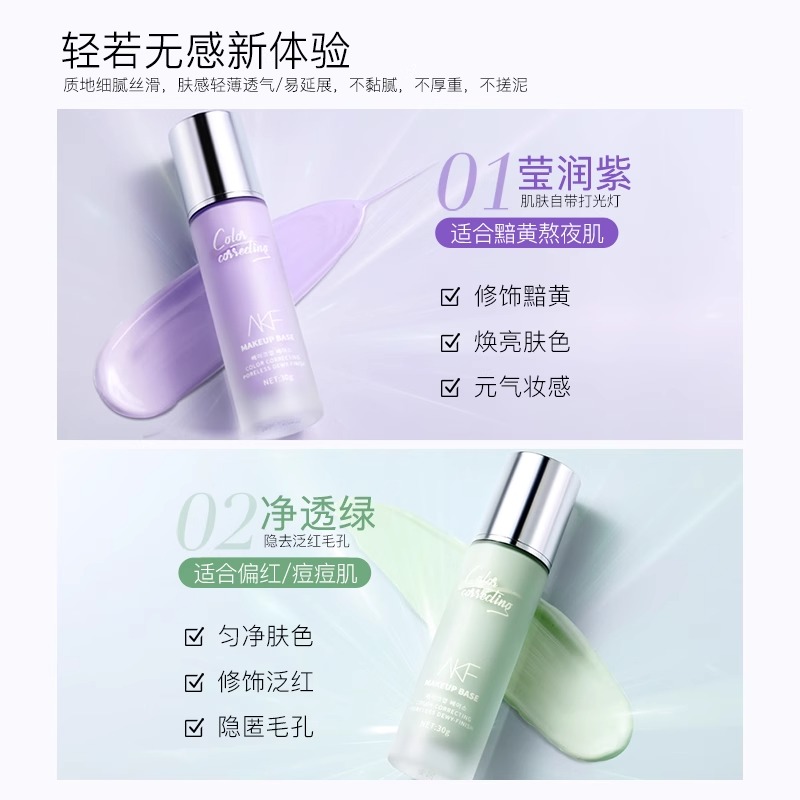 akf隔离霜紫色绿色套盒软管妆前乳打底遮瑕提亮均匀肤色水润轻盈