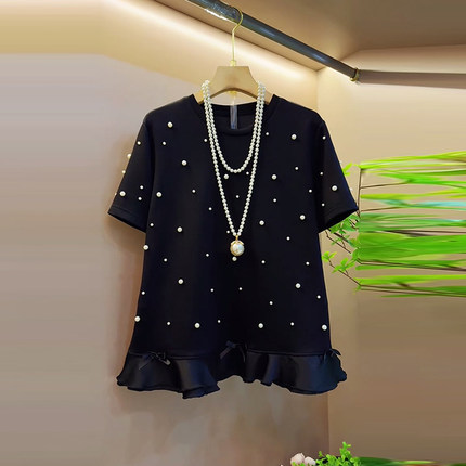 加肥圆领短袖蝴蝶结底摆钉珠上衣韩版大码女装2025夏季款淑女小衫