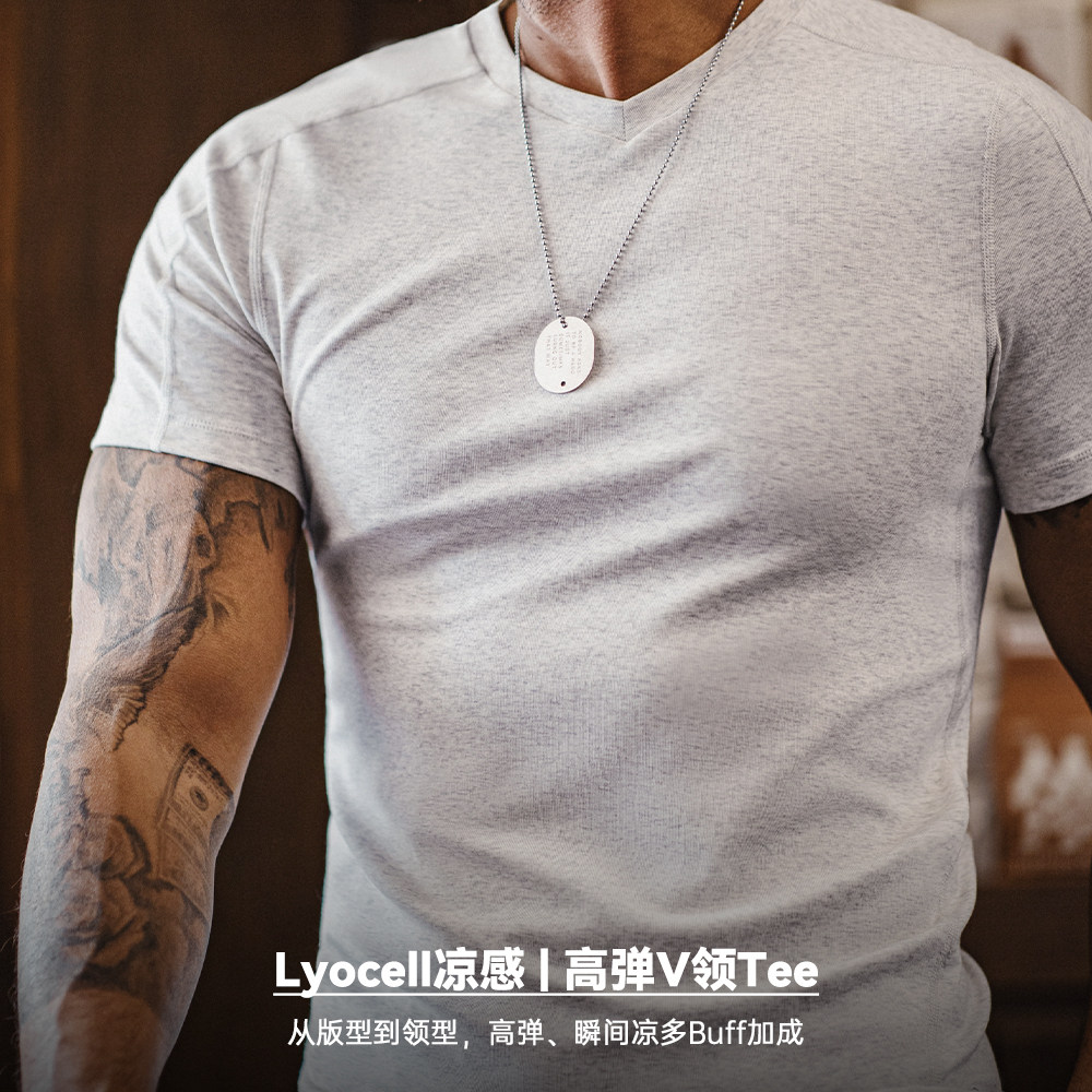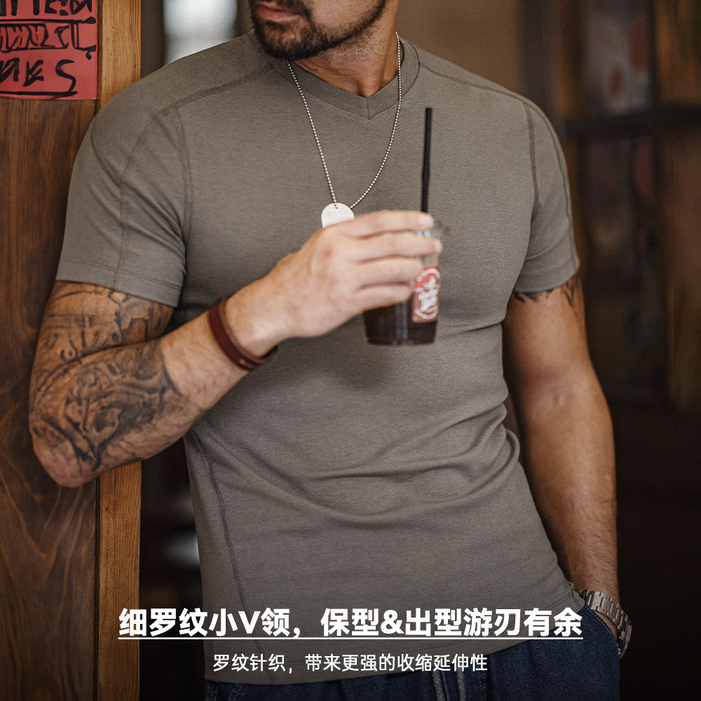 马登工装美式莱赛尔凉感T恤收袖口黑色速干健身衣v领修身短袖男夏