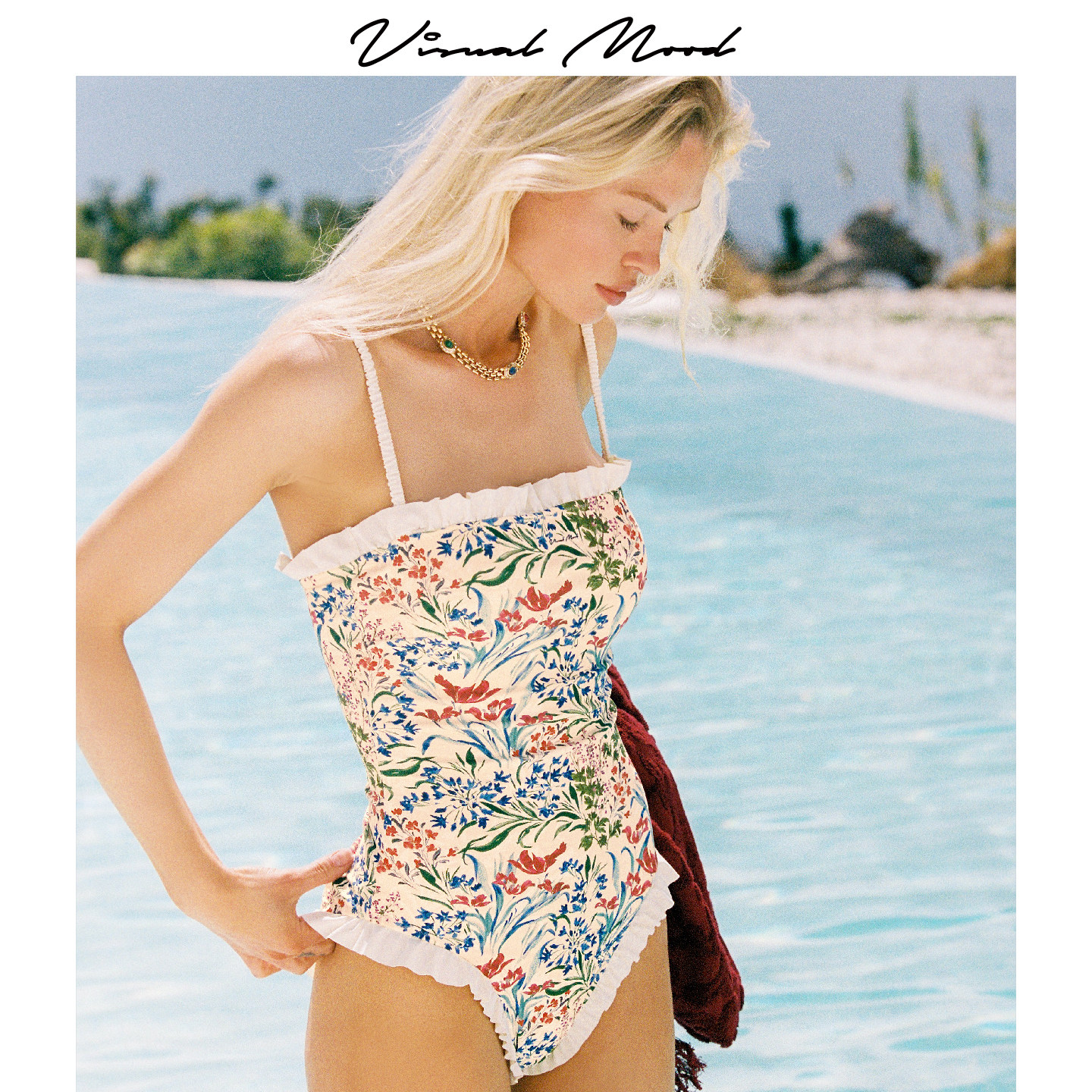 visual mood2025夏季新款抹胸连体泳衣白蓝印花双面显瘦度假泳装