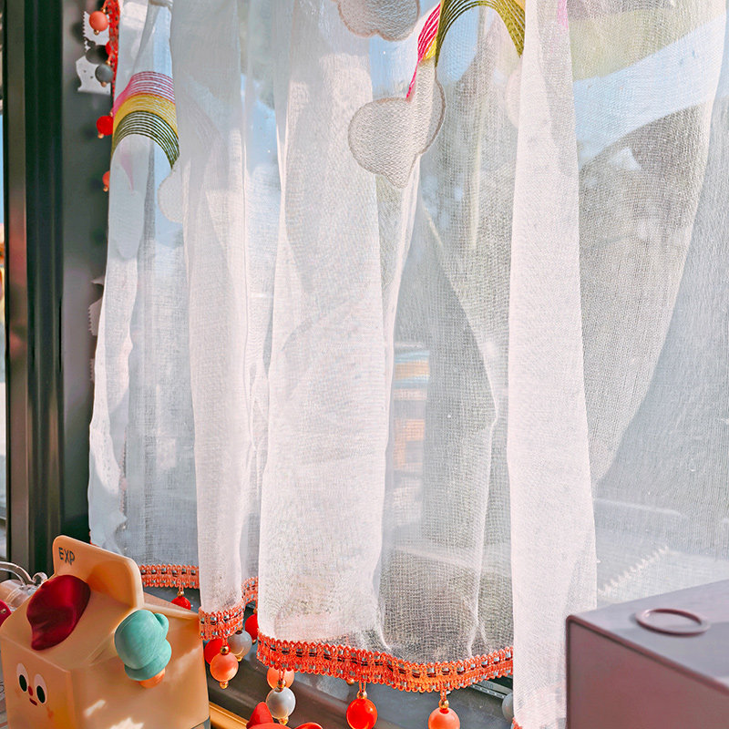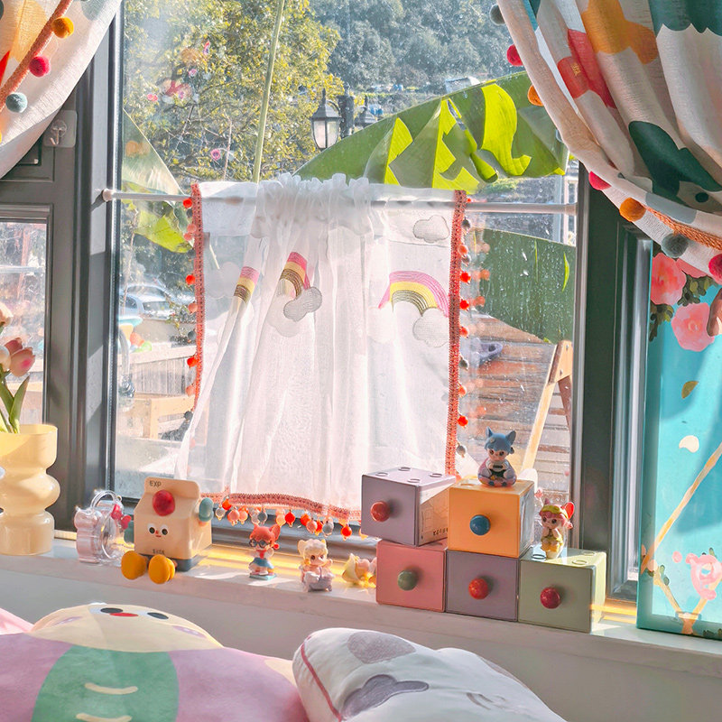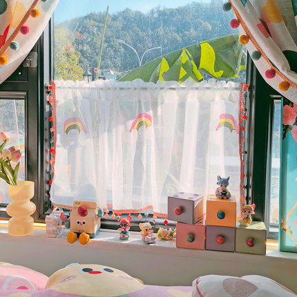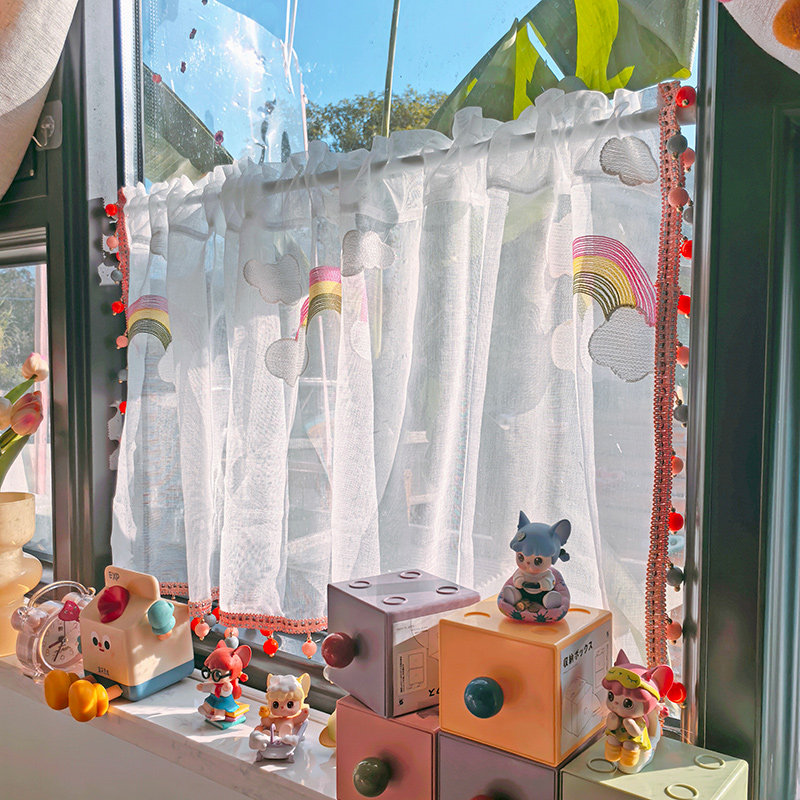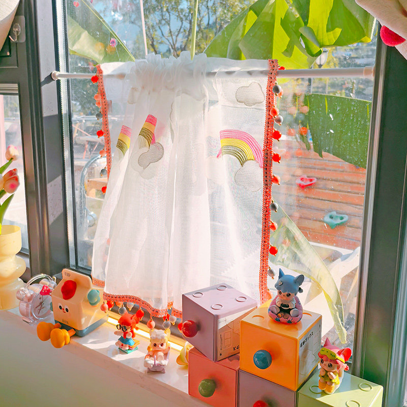 清新小彩虹伸缩杆纱帘阳台半截白色窗帘韩系珠子边帘子透光不透人