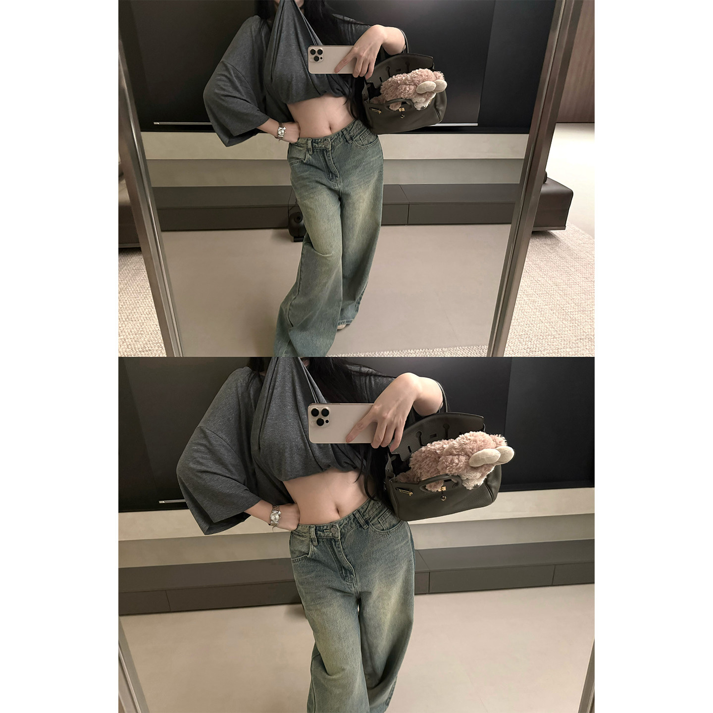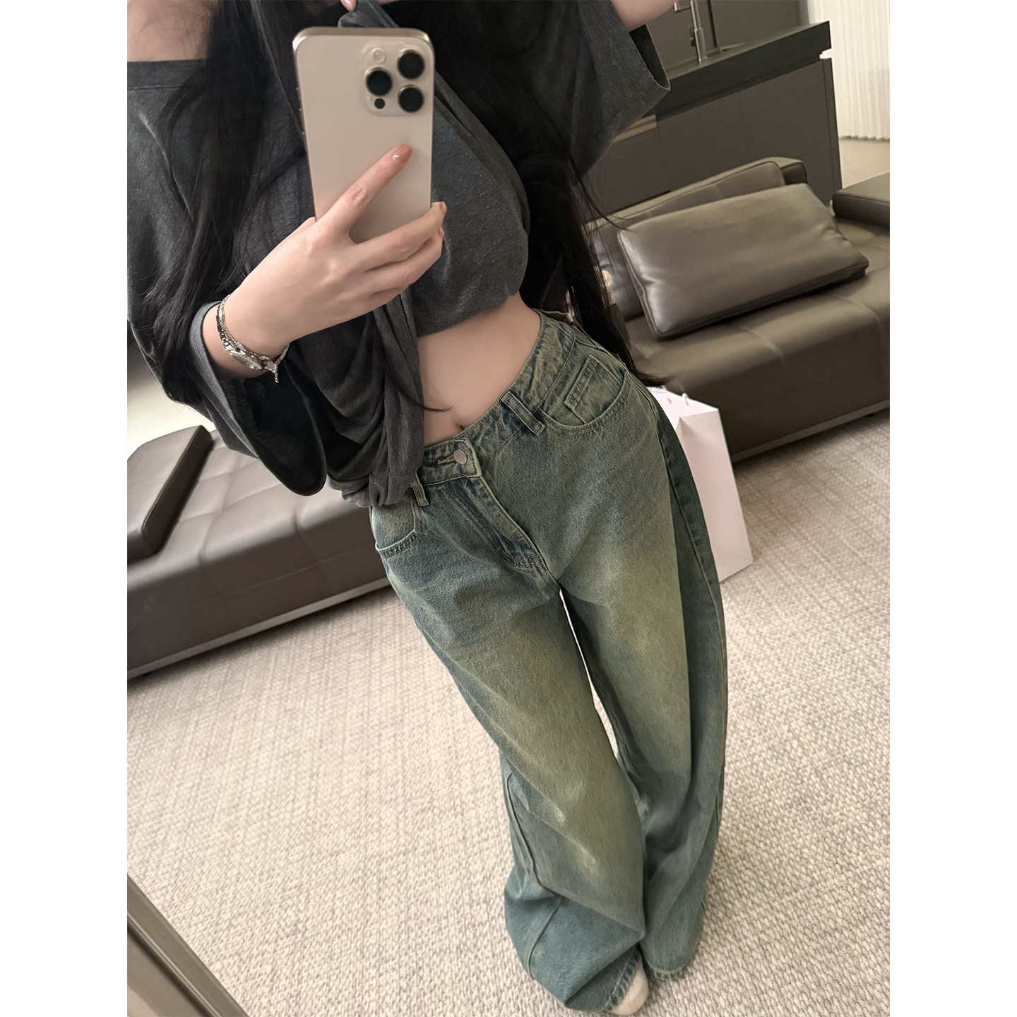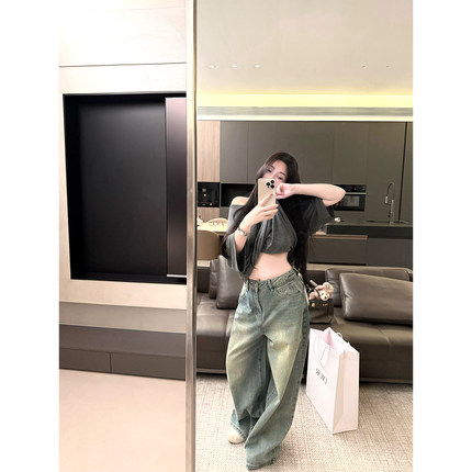 精棉复古多道水洗做旧阔腿牛仔裤