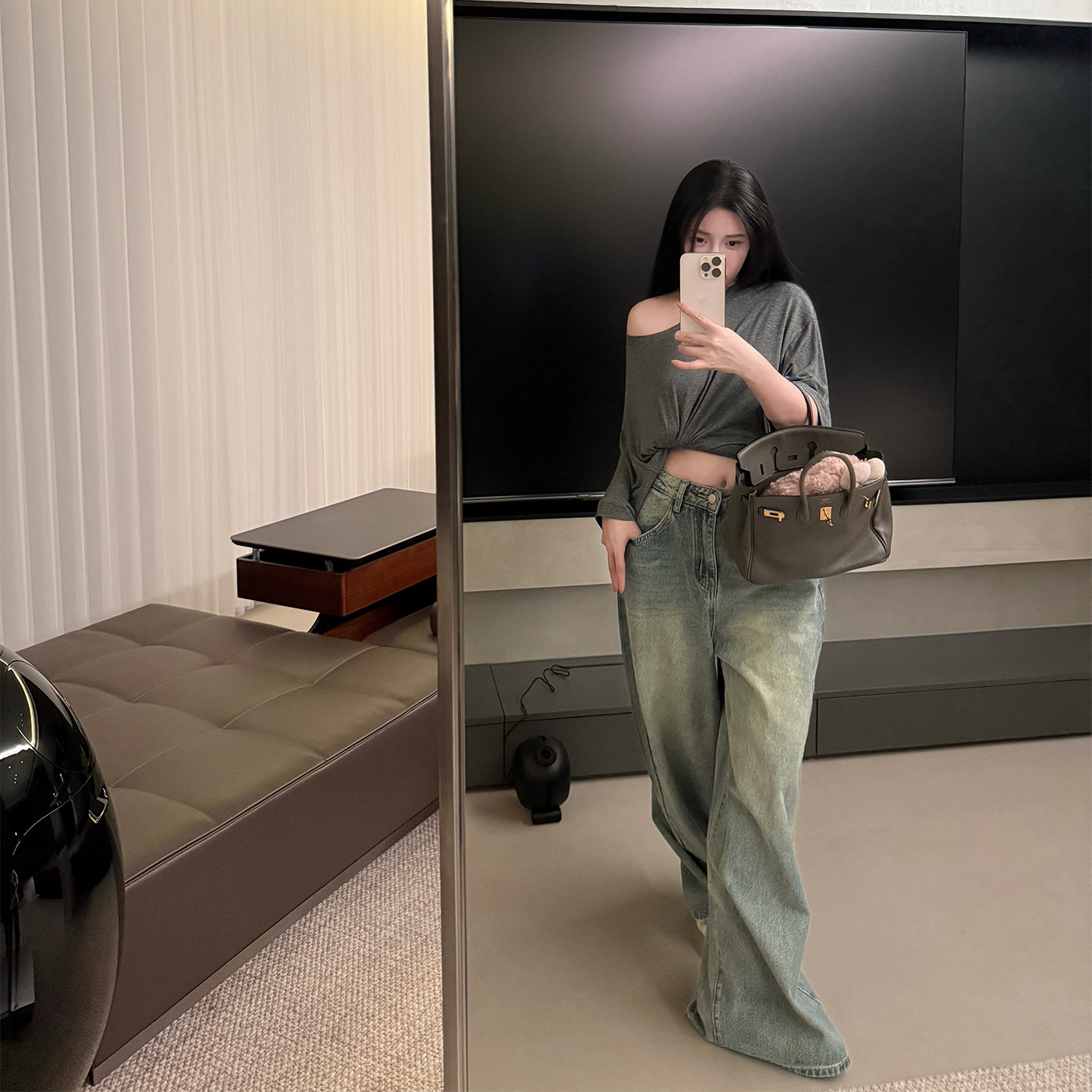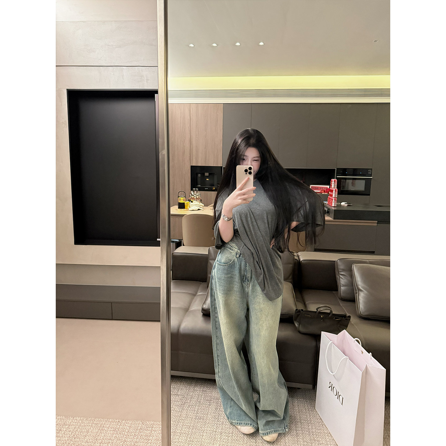 【复古时光机】MISS CHANGE/精棉复古多道水洗磨白做旧阔腿牛仔裤