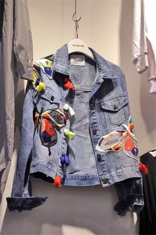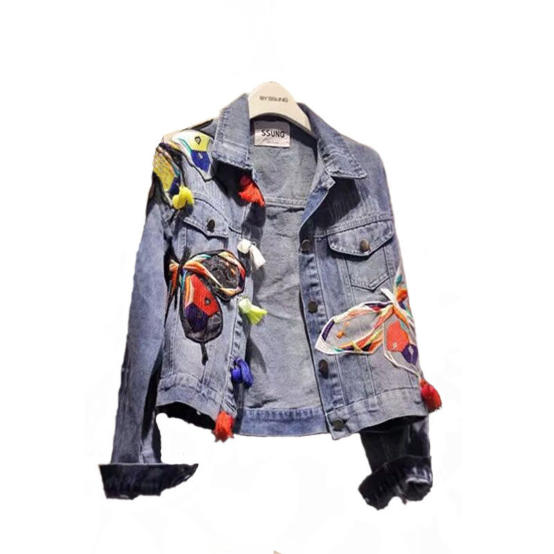 春秋新款贴布翻领牛仔外衣