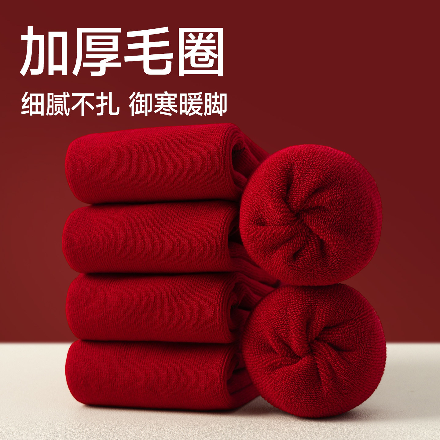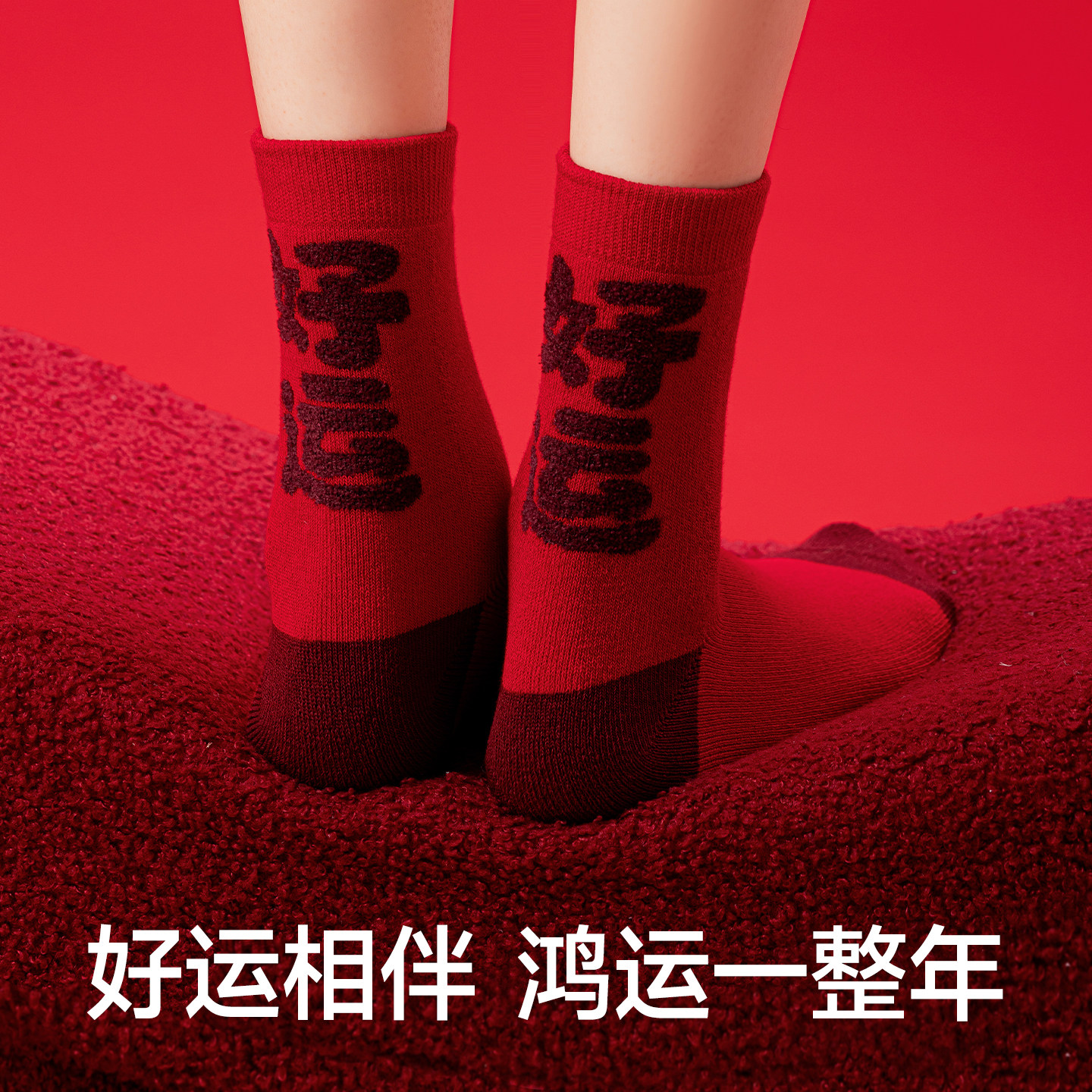 猫人本命年红袜子男女款加绒加厚毛圈中筒袜2026马年情侣结婚礼物