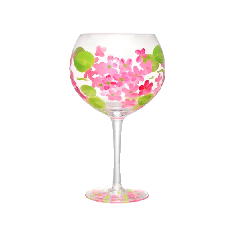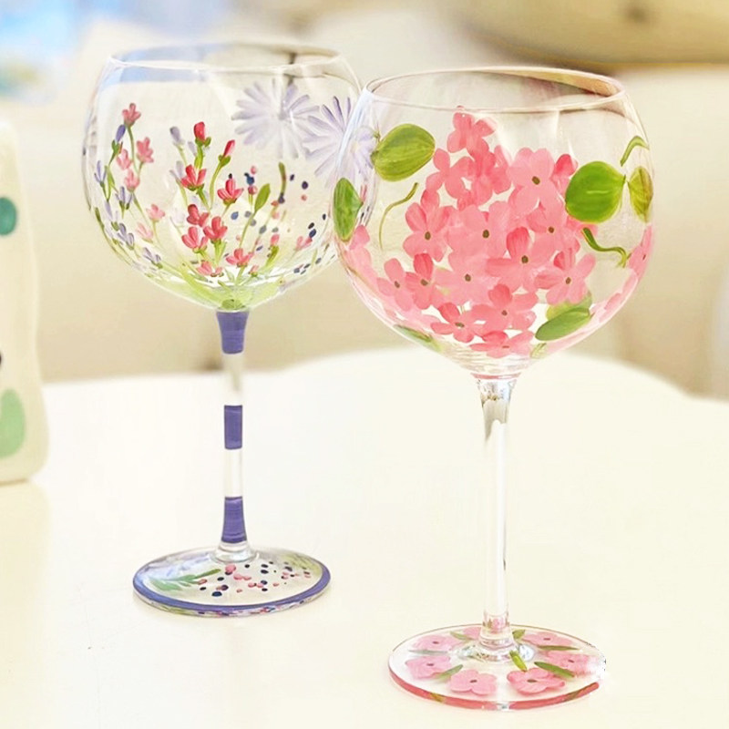 中古风手工手绘花朵水晶玻璃杯高脚杯薰衣草桃花红酒杯葡萄酒杯子
