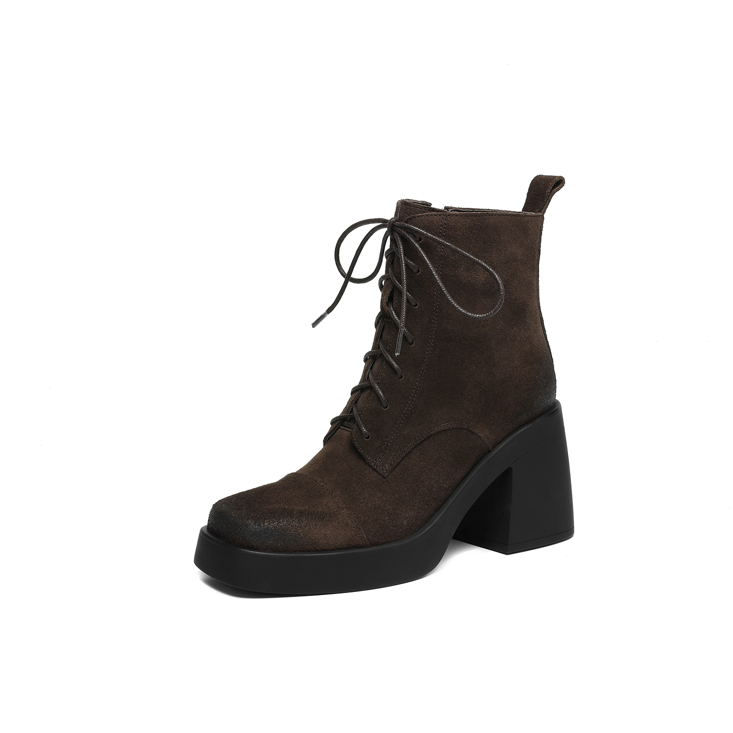 里外全皮方头系带粗跟短靴女