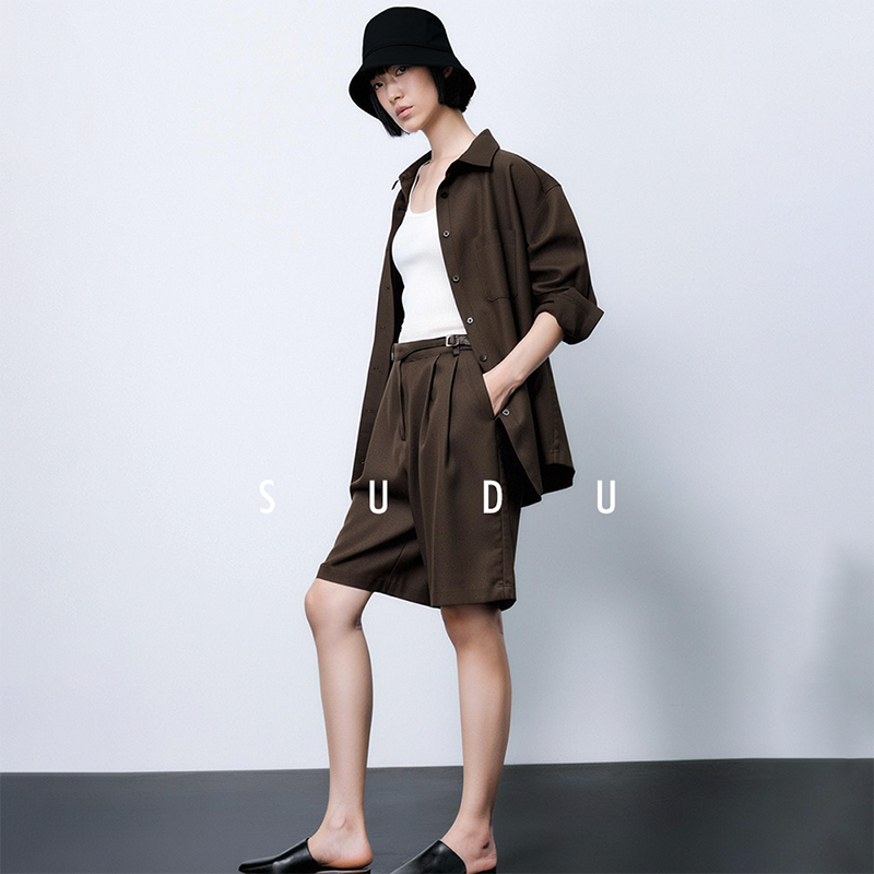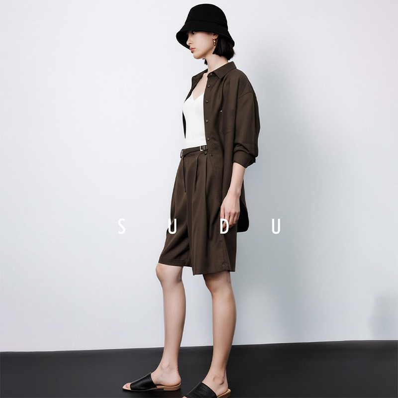SUDU素都纯色简约五分中裤女2025早秋新款微宽松百搭高腰直筒裤子