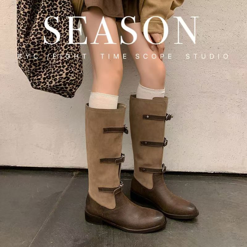 秋冬巨好看圆头牛皮骑士靴高筒粗跟皮带扣女靴子长筒靴不过膝长靴