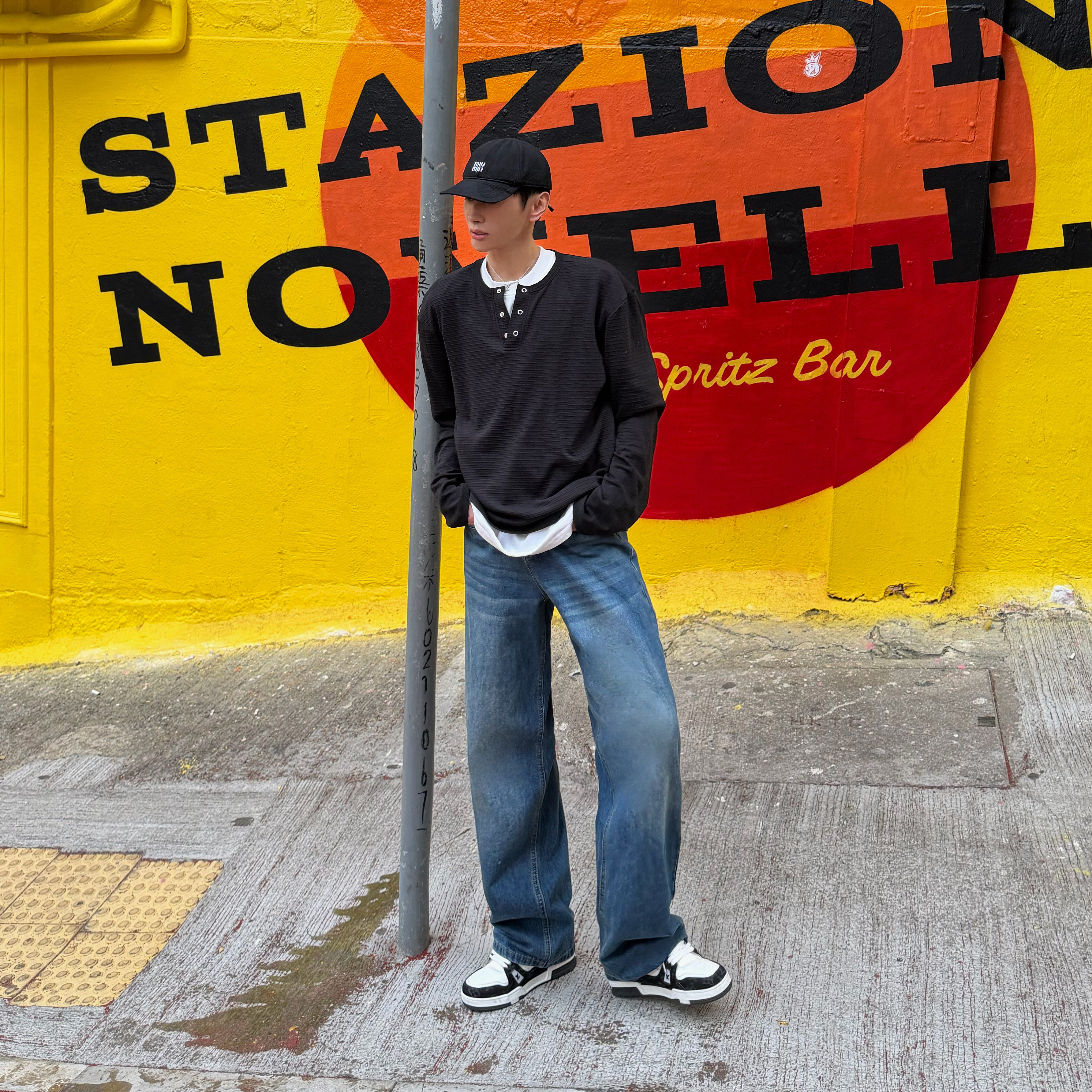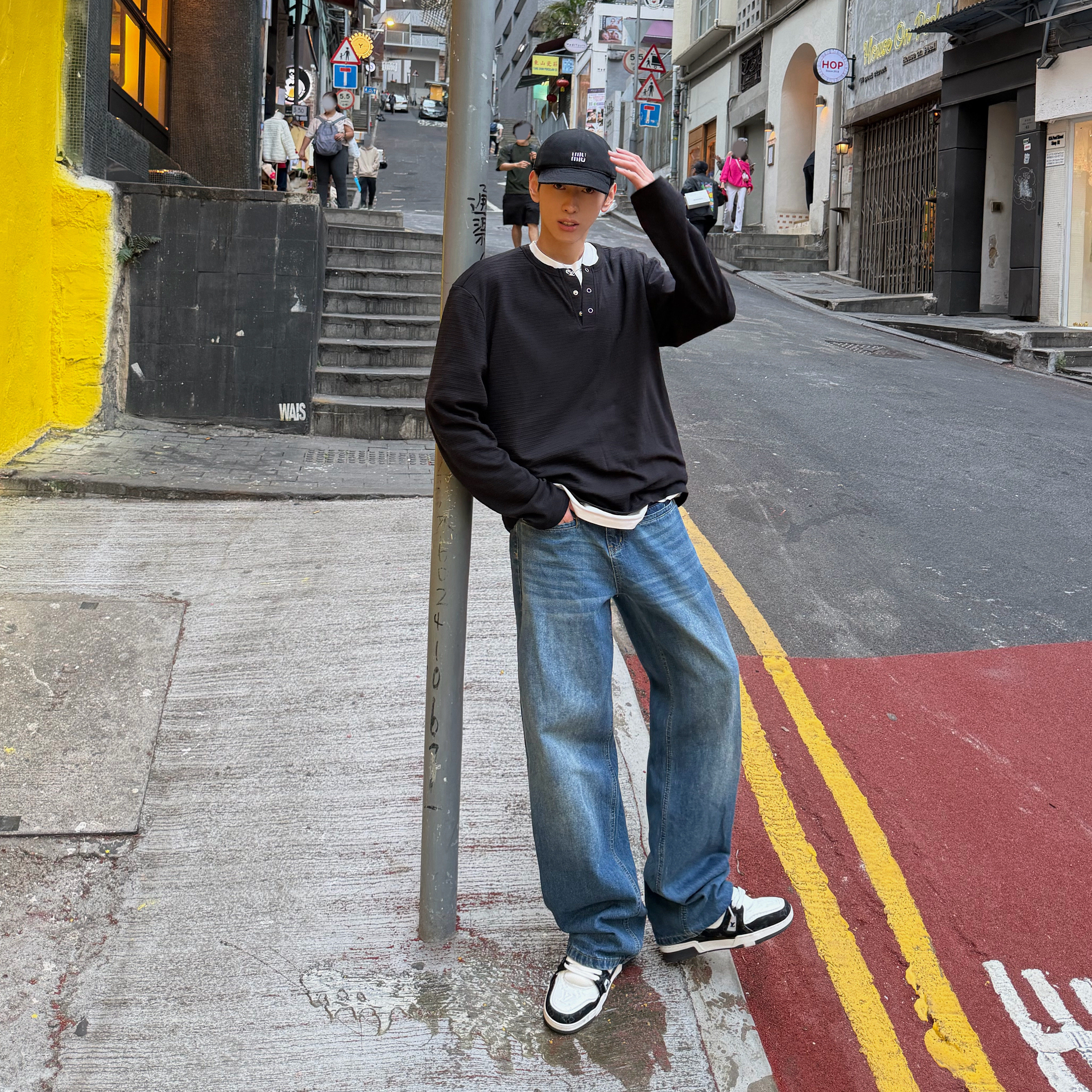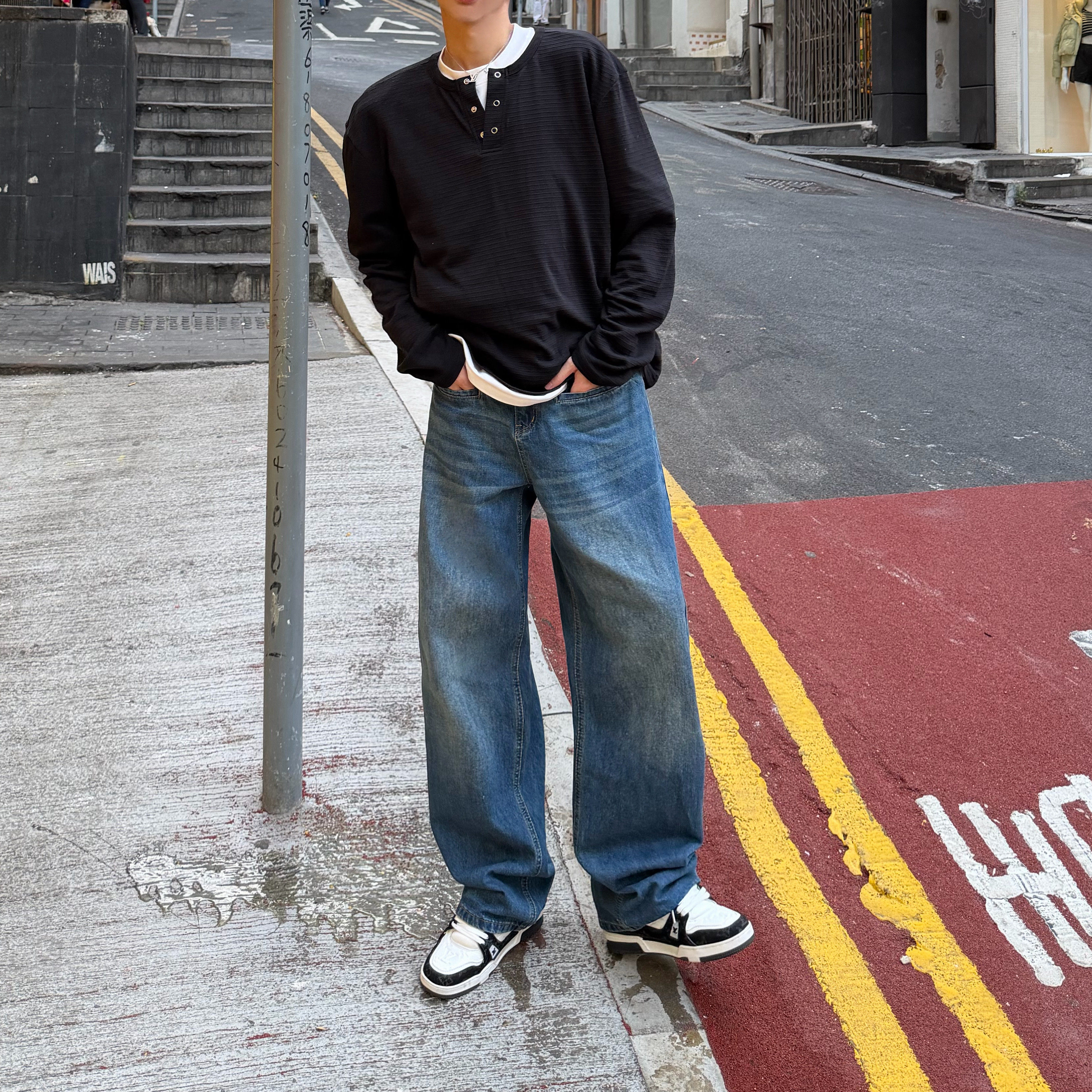 XMOB复古水洗深蓝色直筒牛仔裤