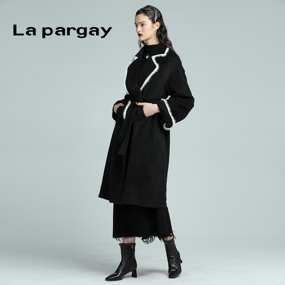 Lapargay纳帕佳新款女装冬季黑色中长款针织大衣毛呢外套风衣