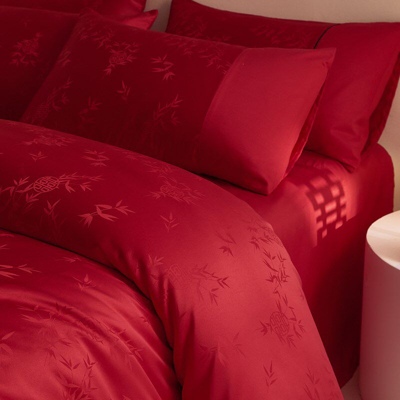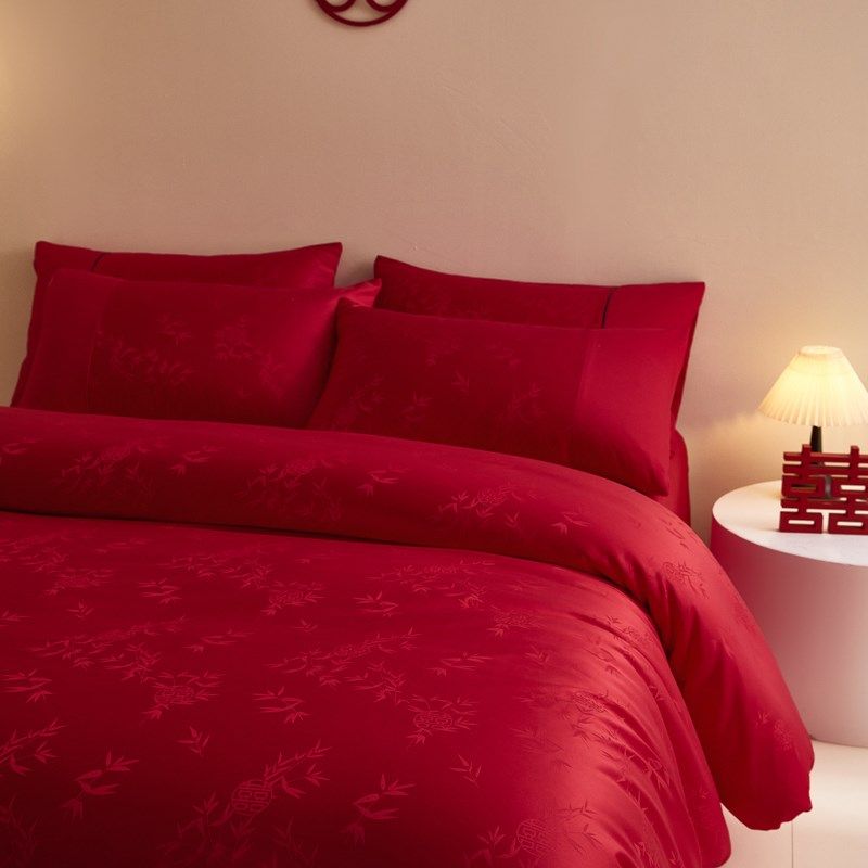 高端婚庆水洗棉提花婚庆四件套红色纯棉床单被套新婚喜被床上用品