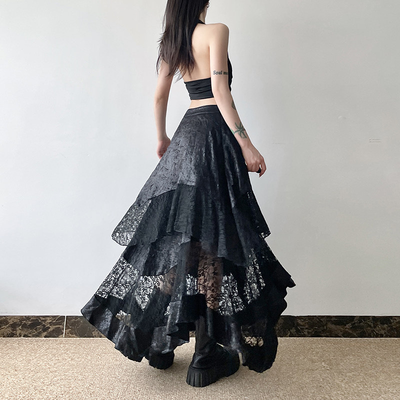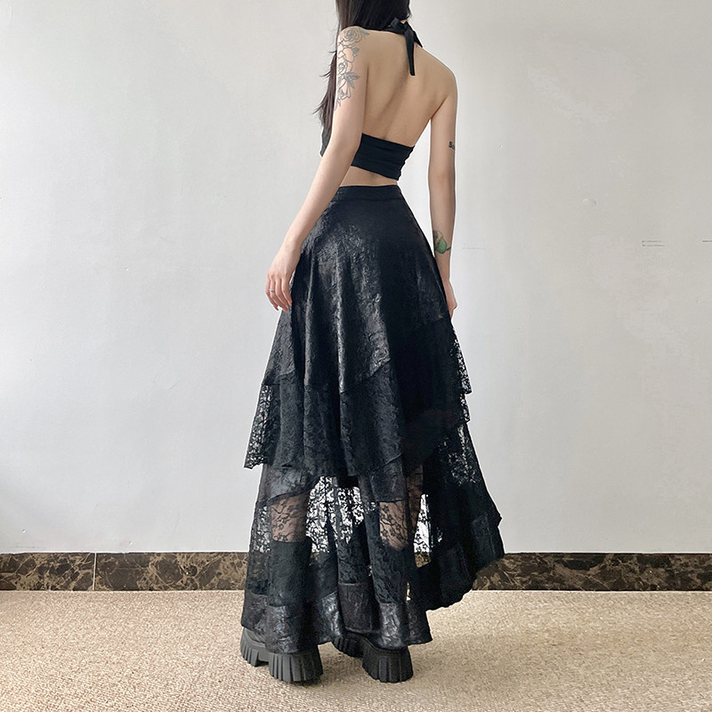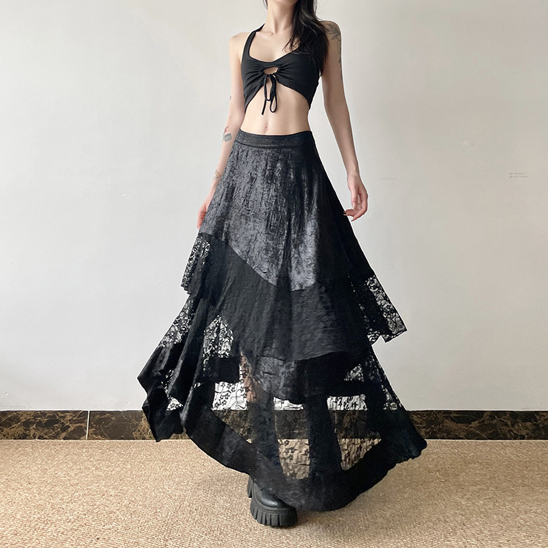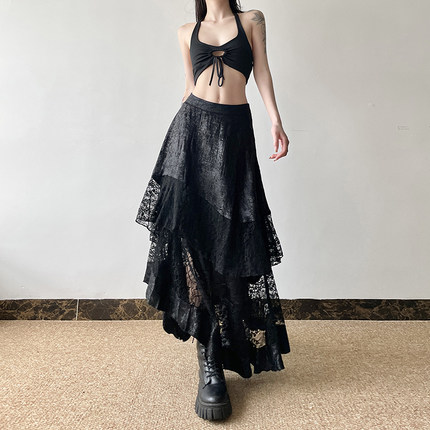 gagaopt2025新款夏季设计感蕾丝拼接不规则半身裙高腰显瘦A字长裙
