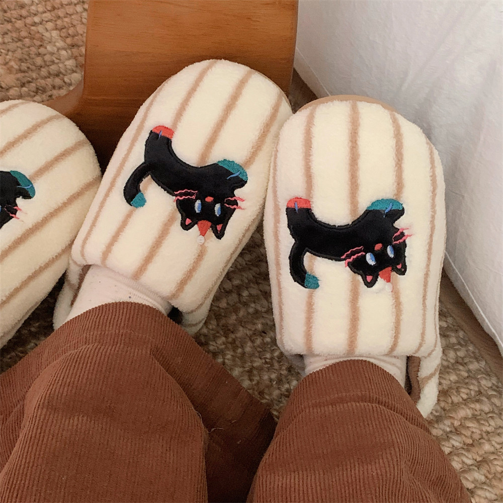 细细条 条纹小黑猫居家鞋韩系百搭休闲情侣卡通保暖棉拖鞋男女冬