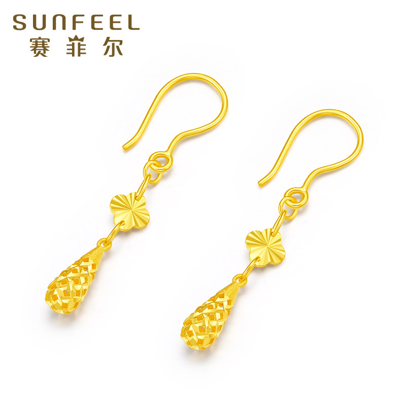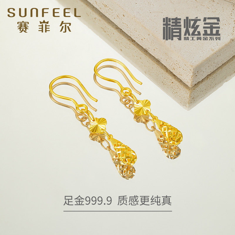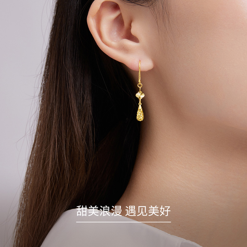 赛菲尔黄金耳饰女足金999.9四叶草长款水滴耳吊精炫金生日礼物