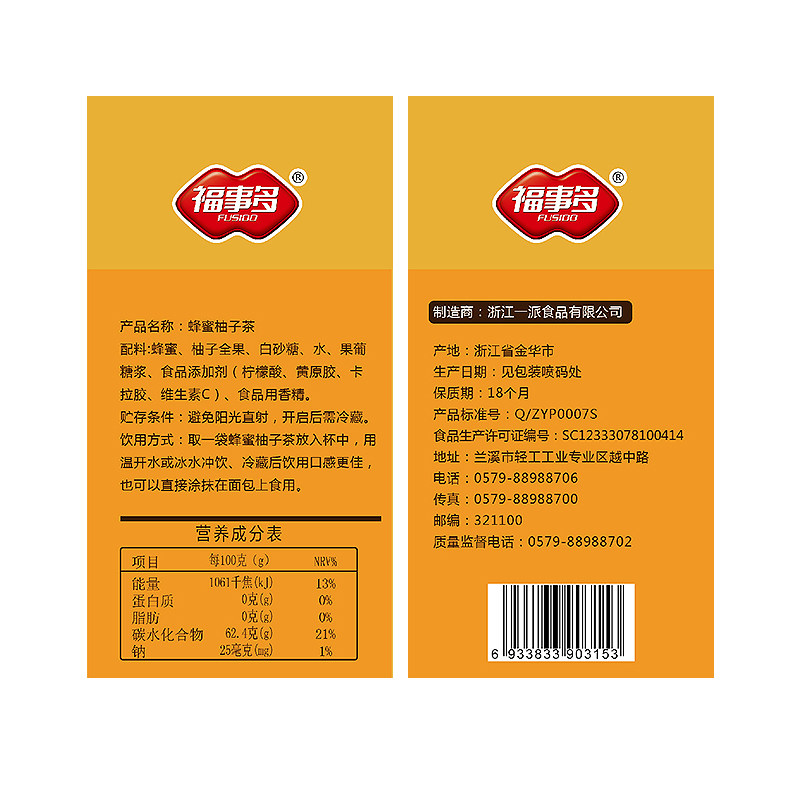 福事多蜂蜜柚子茶冲饮小袋装便携水果茶冲水喝的饮品泡水420g