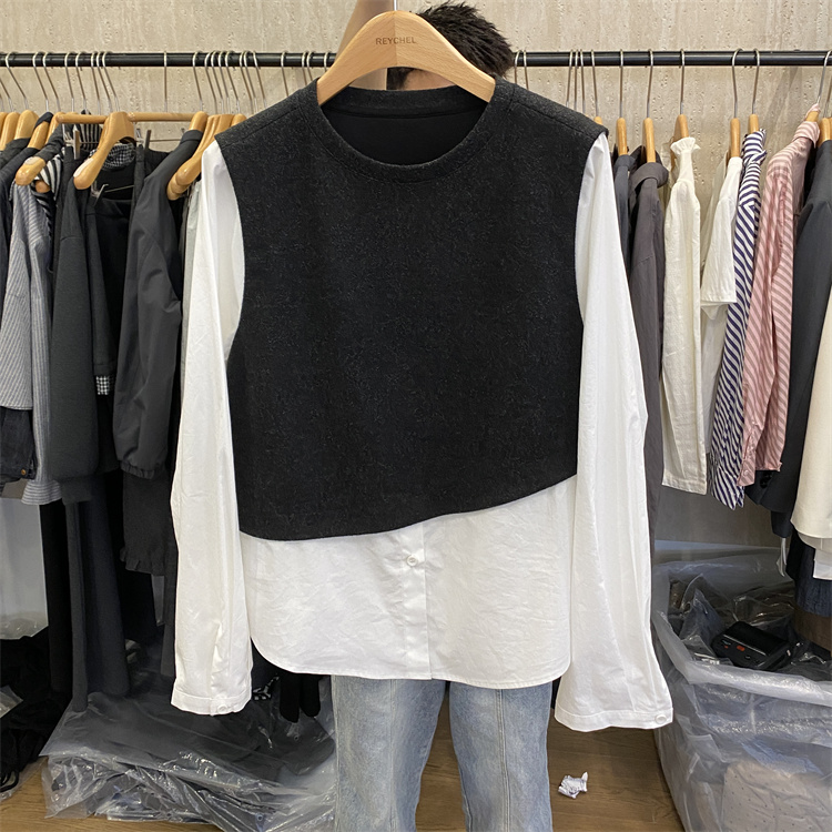 韩国东大门25秋装新款接拼设计感时尚韩版显瘦假两件圆领百搭衬衫