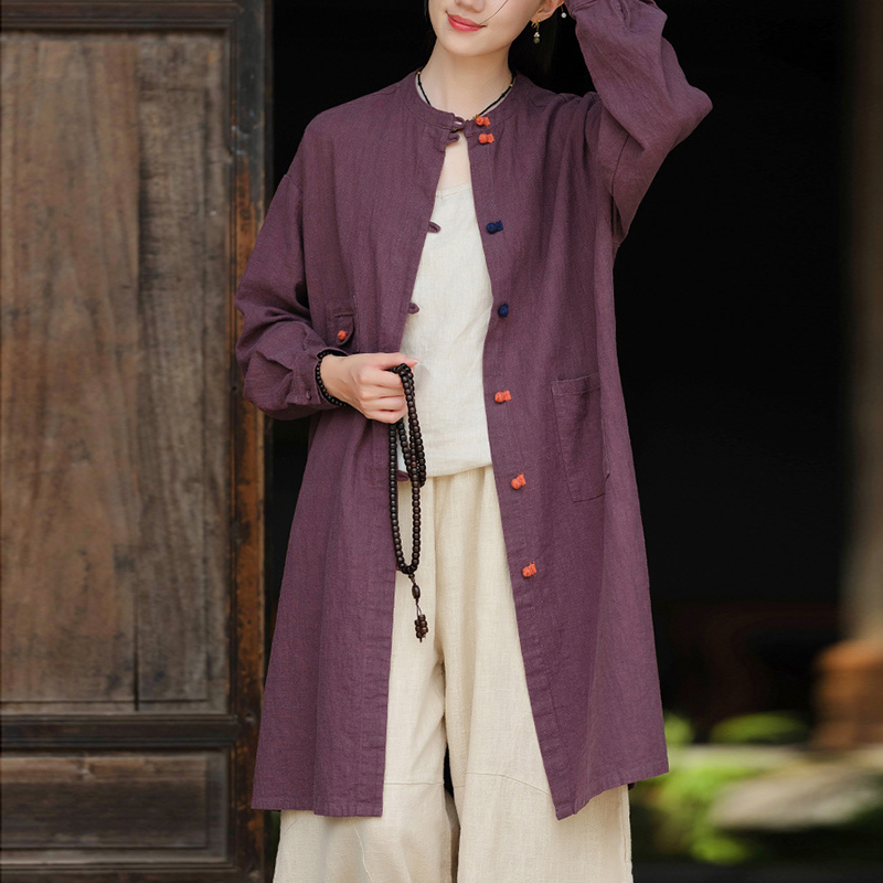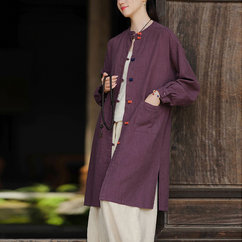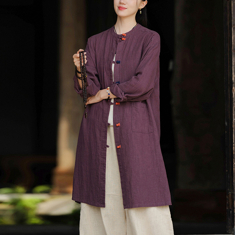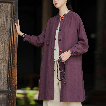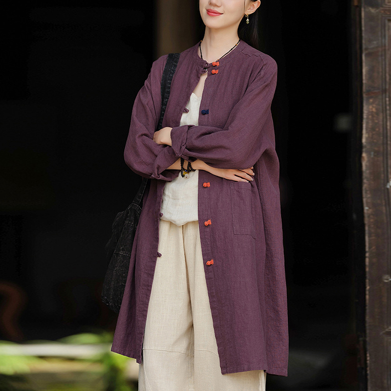 新款2025棉麻女中长款外套复古立领撞色盘扣上衣砂洗衬衫纯色开衫