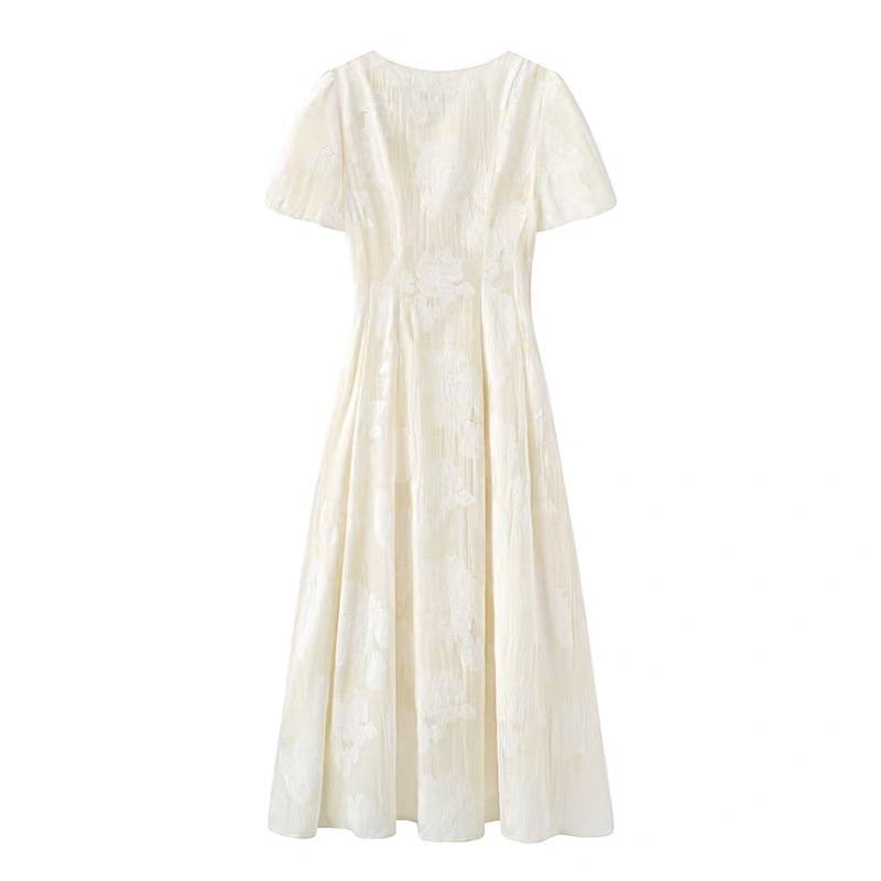 连衣裙 V领提花工艺泡泡袖时尚优雅气质中长款短袖A字 连衣裙0.27