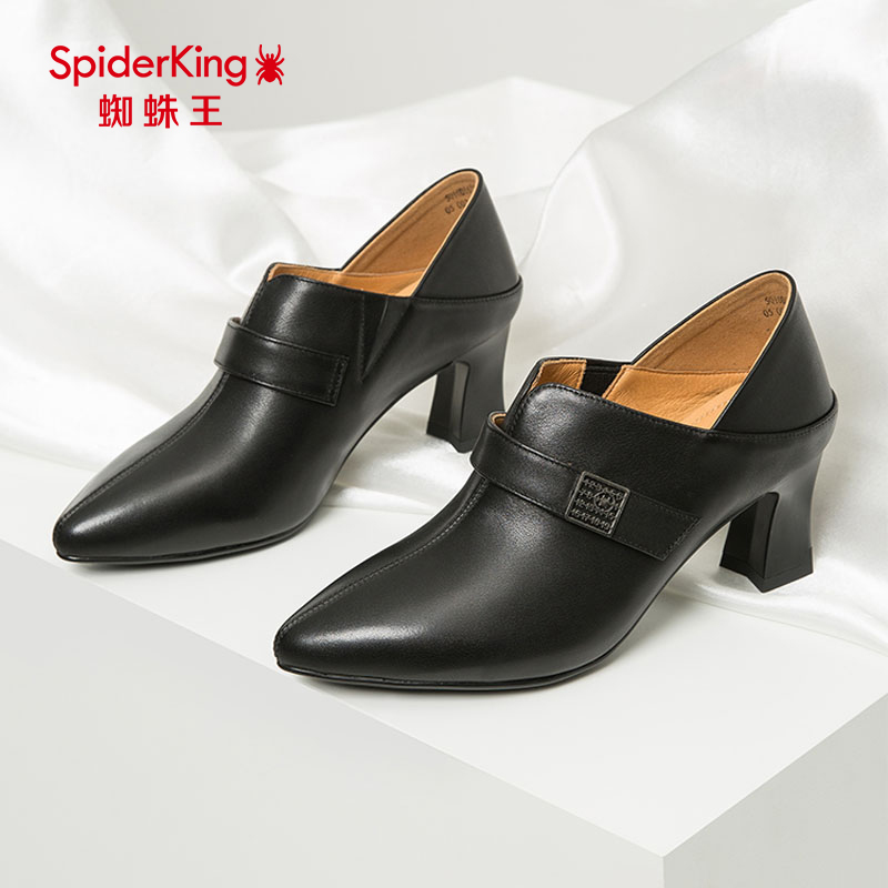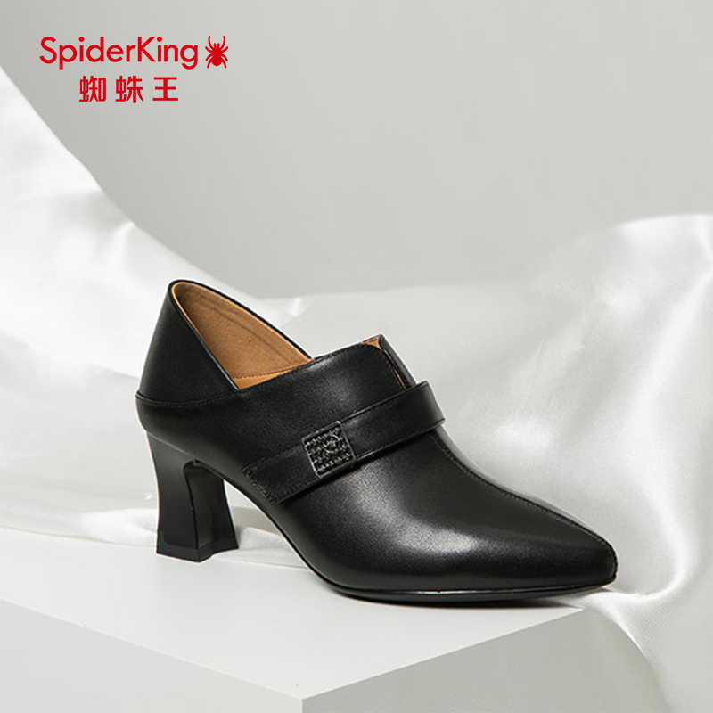 蜘蛛王女鞋时尚百搭踝靴气质尖头粗跟黑色女士高跟鞋职业通勤单鞋