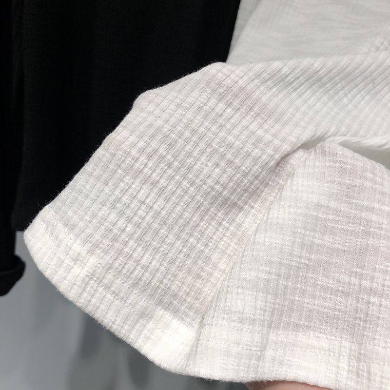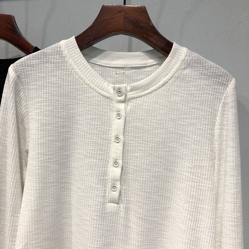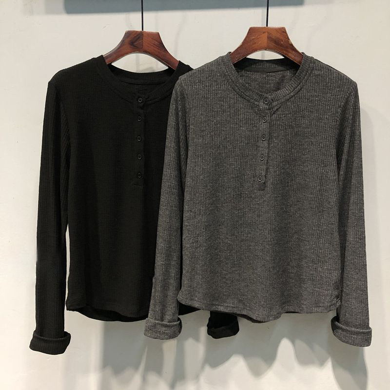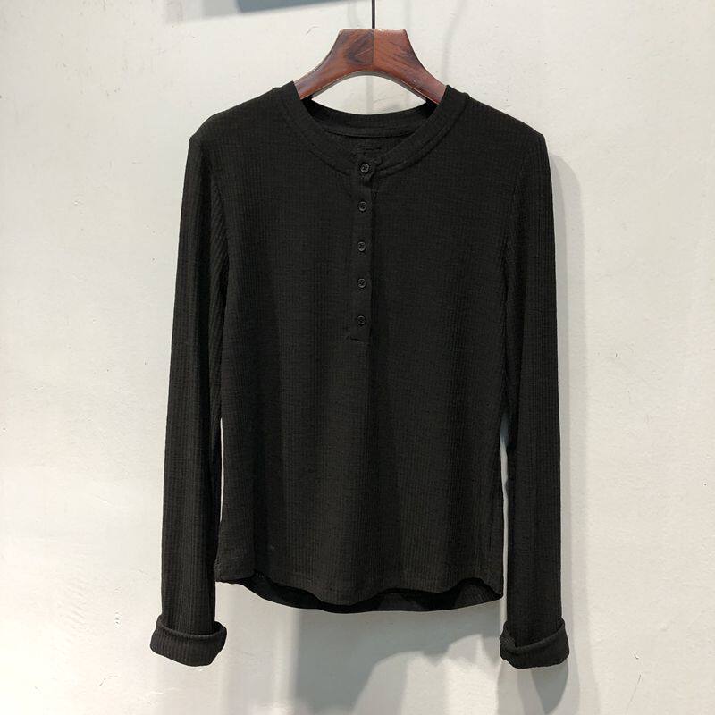 纽扣圆领设计感小众长袖T恤女春秋宽松韩版竹节棉打底衫上衣内搭