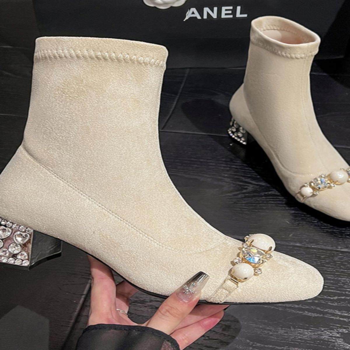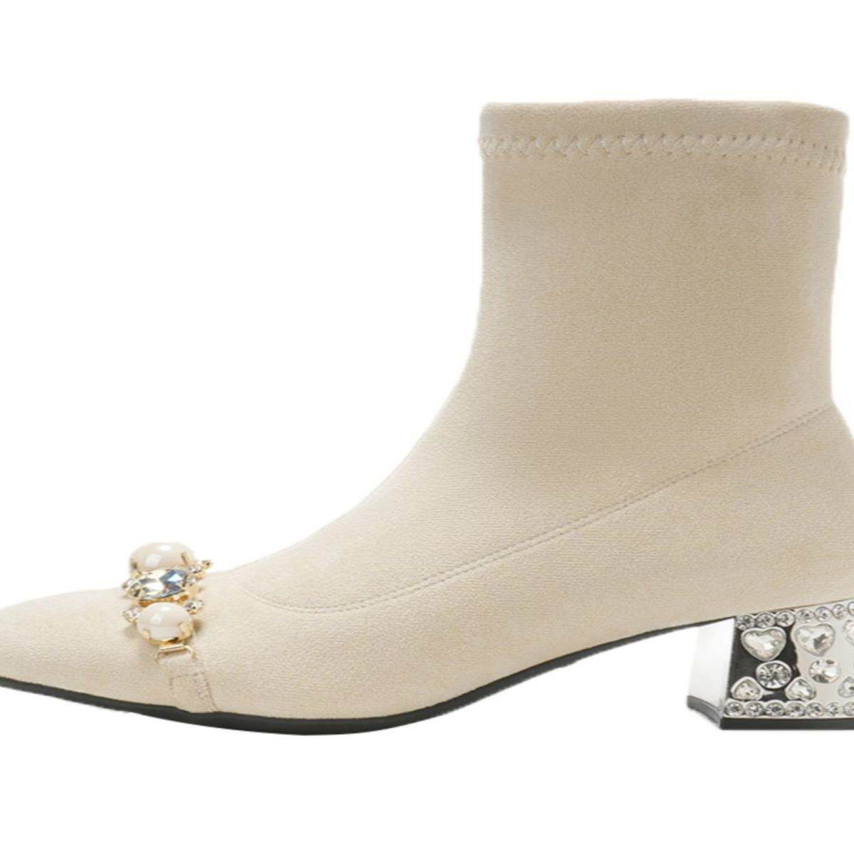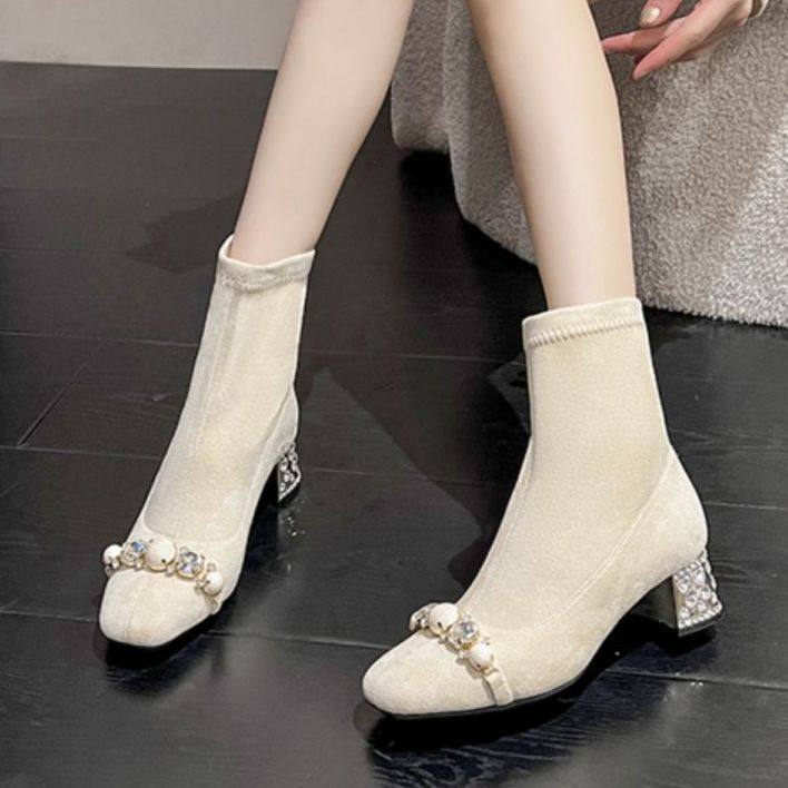 显瘦短靴女2025新款秋冬水钻甜美粗跟洋气高跟弹力瘦瘦靴马丁靴子