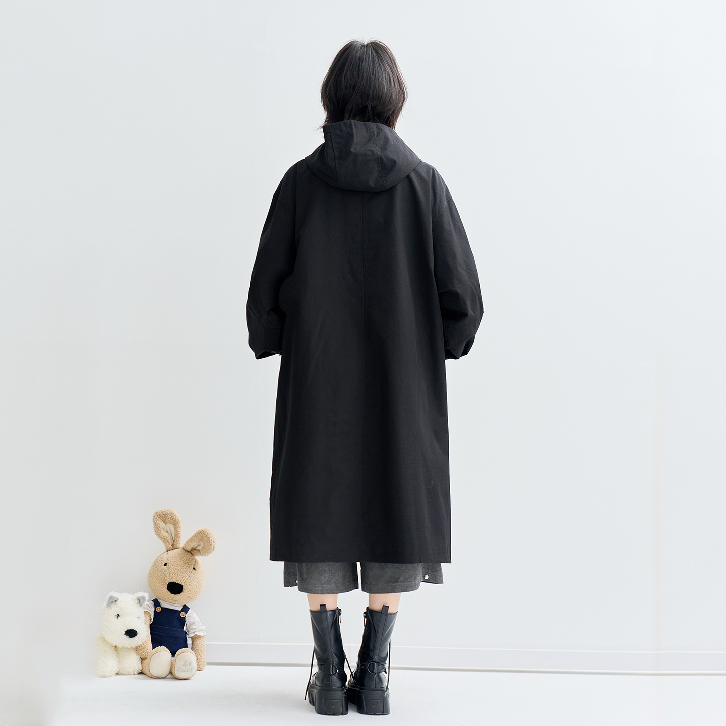 万有引力博物馆 黑色连帽风衣外套女春秋款宽松中长款过膝大衣