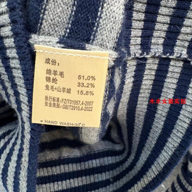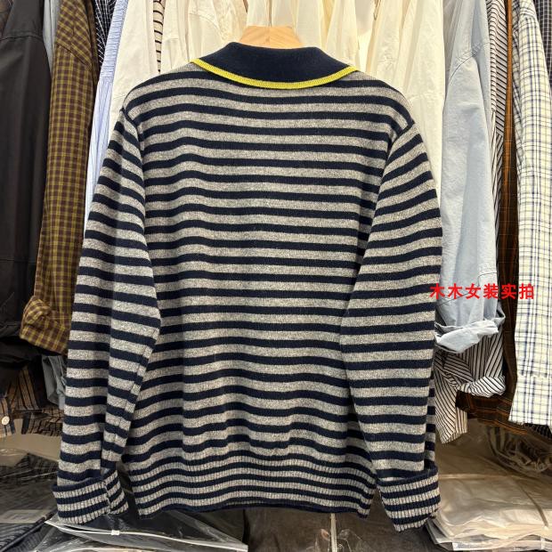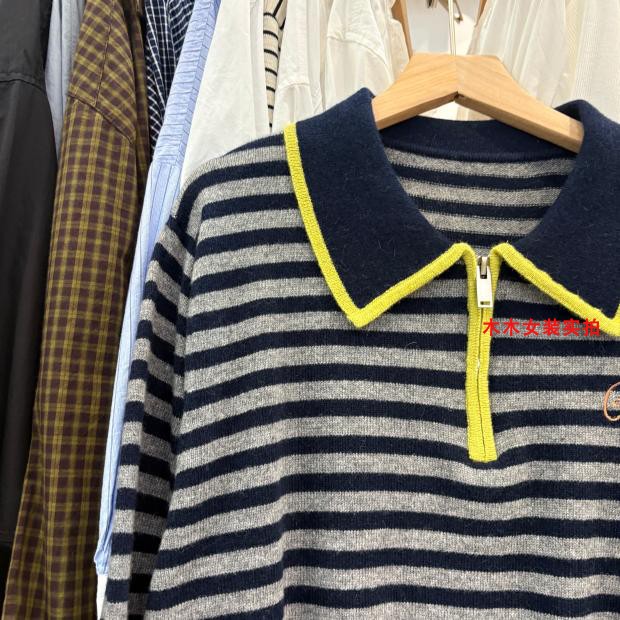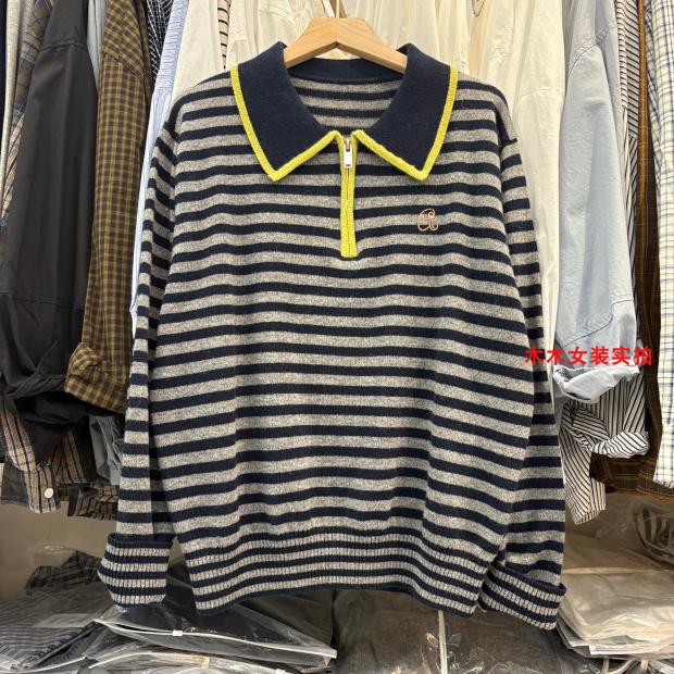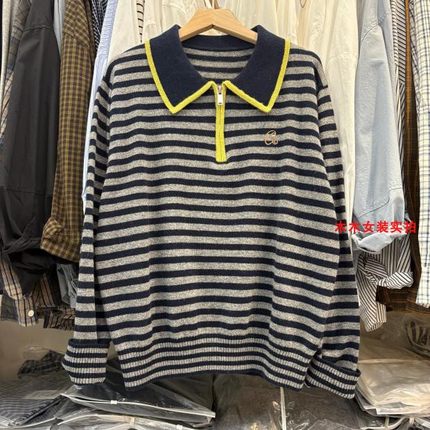 老钱风翻领秋季羊毛混纺套头针织衫女宽松条纹休闲毛衣百搭外套