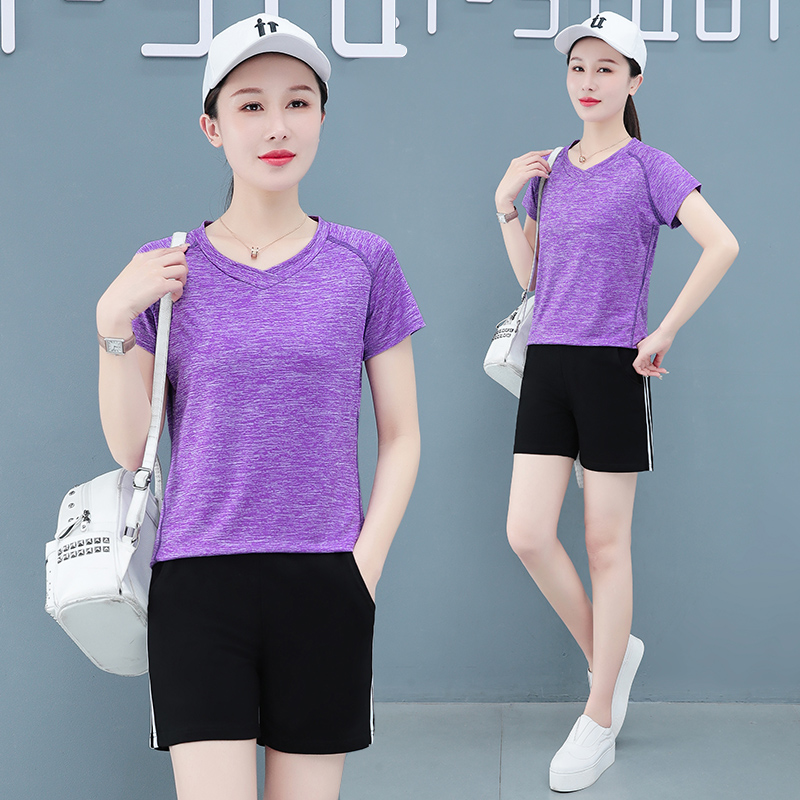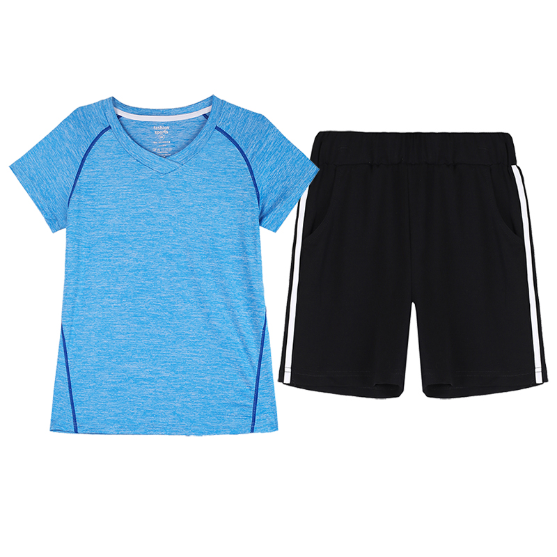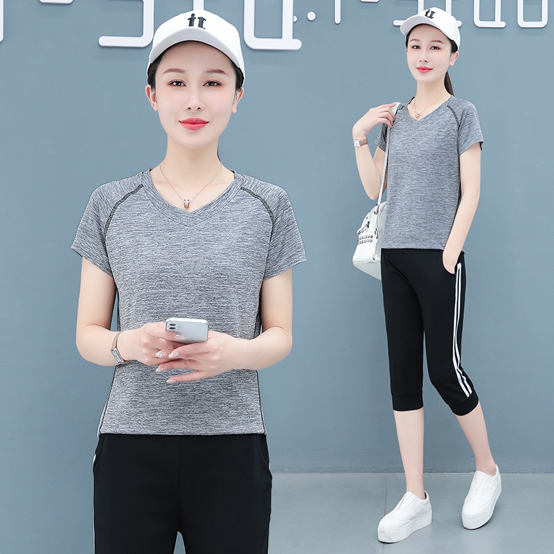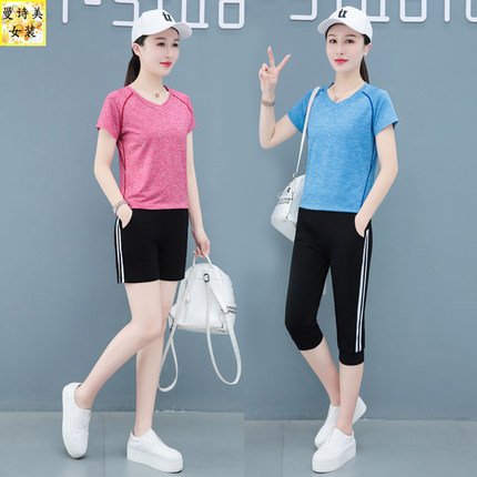 V领冰丝速干短袖运动套装女士夏季薄款跑步运动短裤七分裤两件套