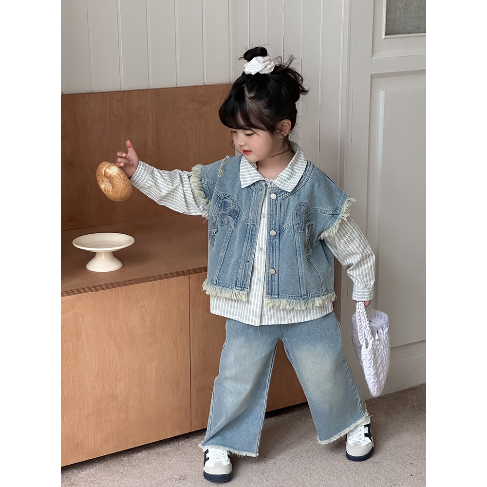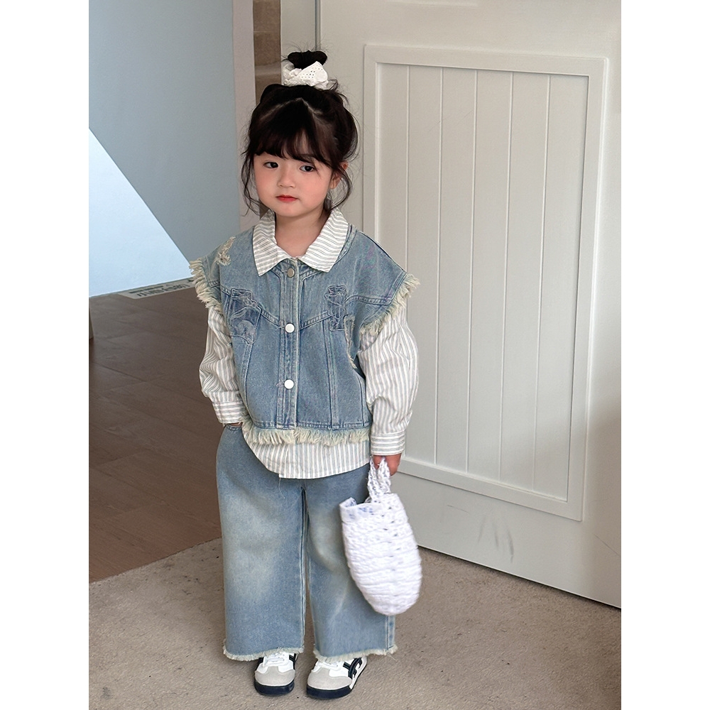 日本品质【现货福利】女童长袖衬衫春秋季新款时髦无袖牛仔马甲阔