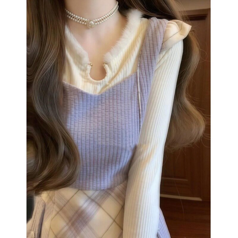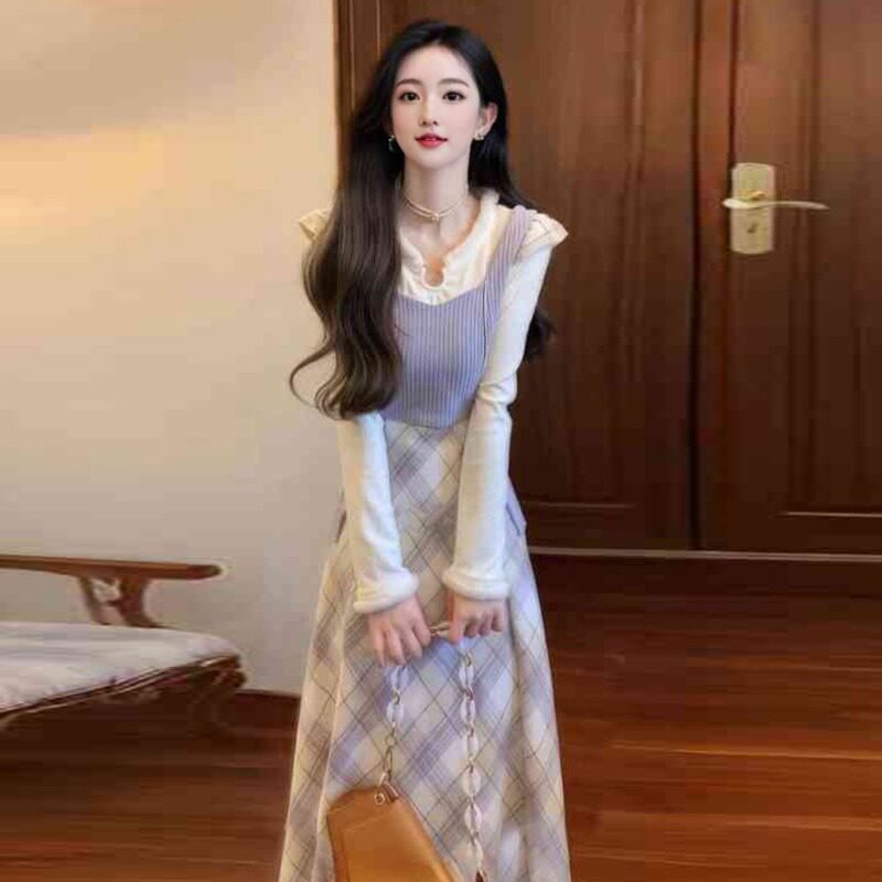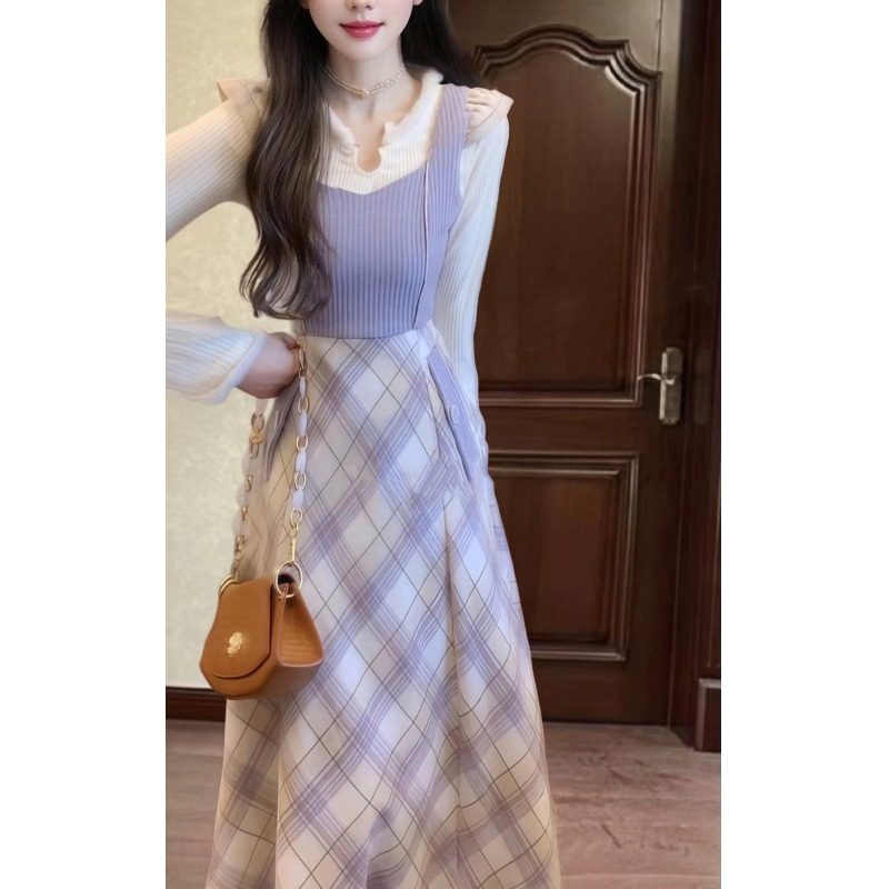 秋冬季裙子女法式气质针织打底衫收腰紫色格子吊带连衣裙两件套装