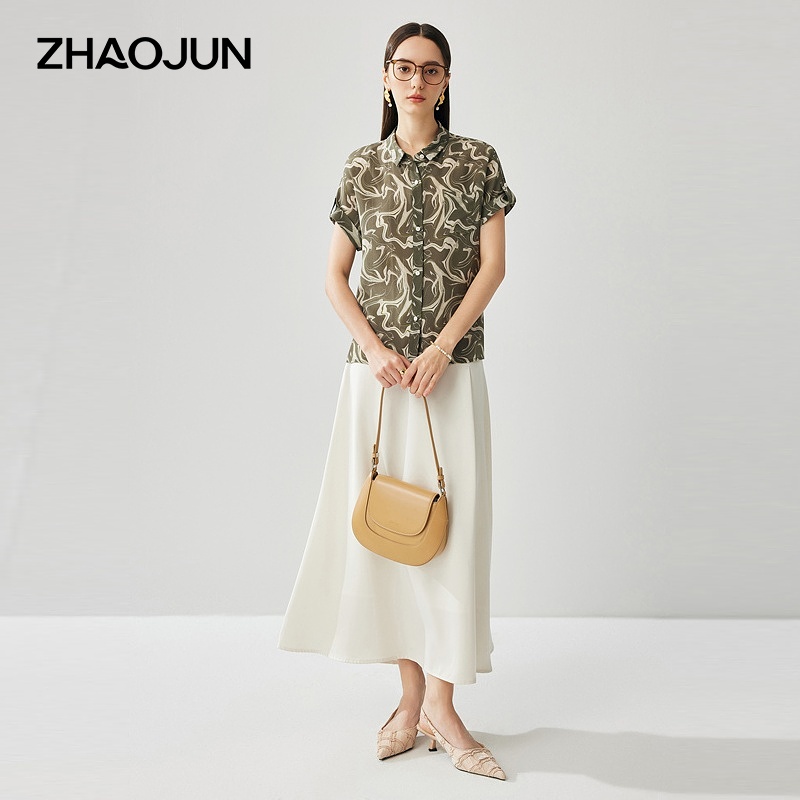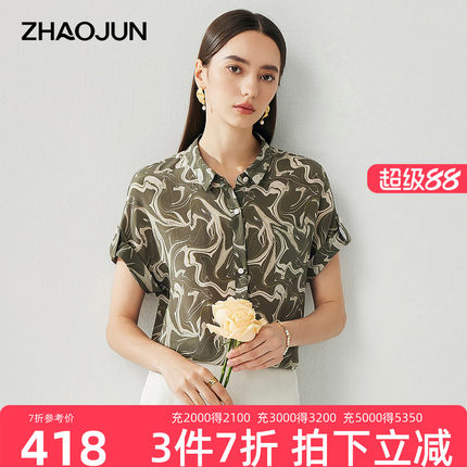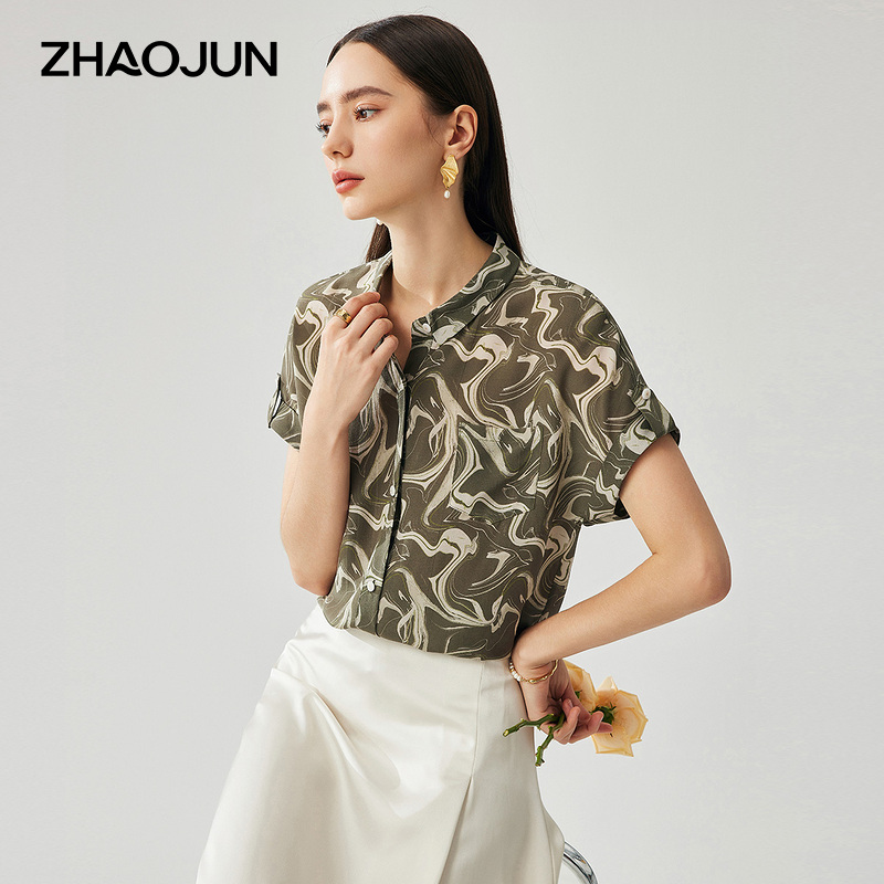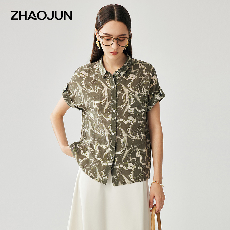 兆君2025春夏桑蚕丝新款水波纹衬衫女翻领短袖衬衣真丝双绉上衣