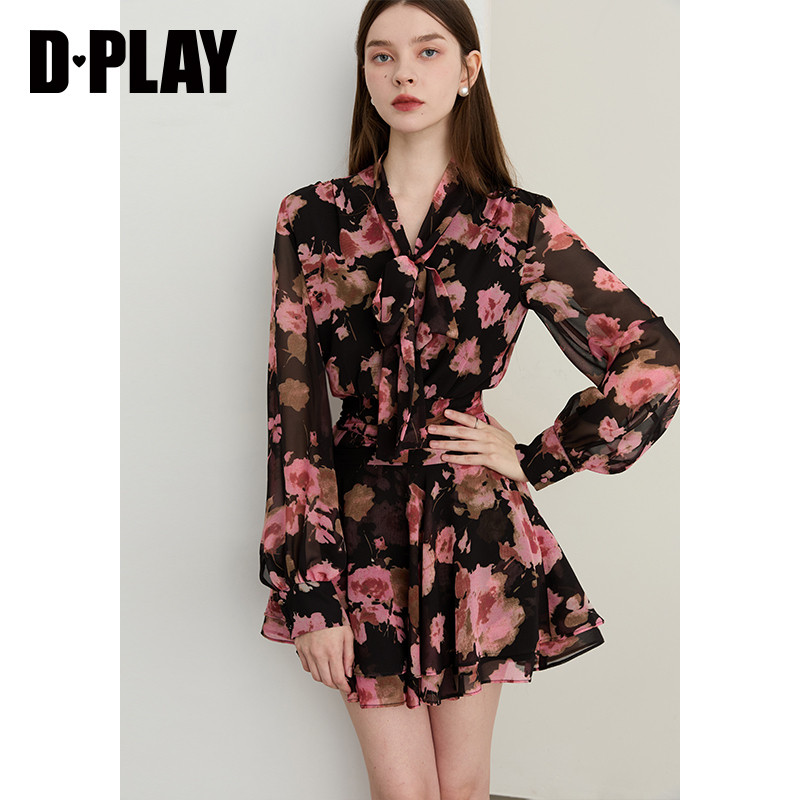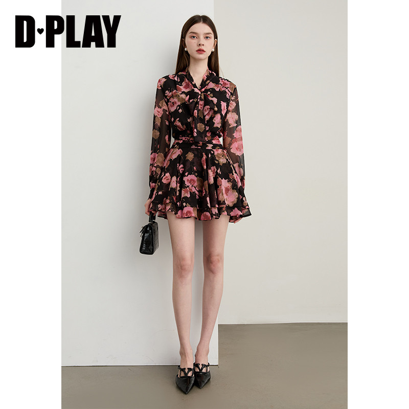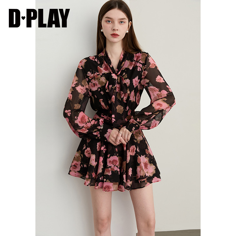 DPLAY2026春季新款粉黑色连衣裙女好看独特法式雪纺裙子长袖短裙