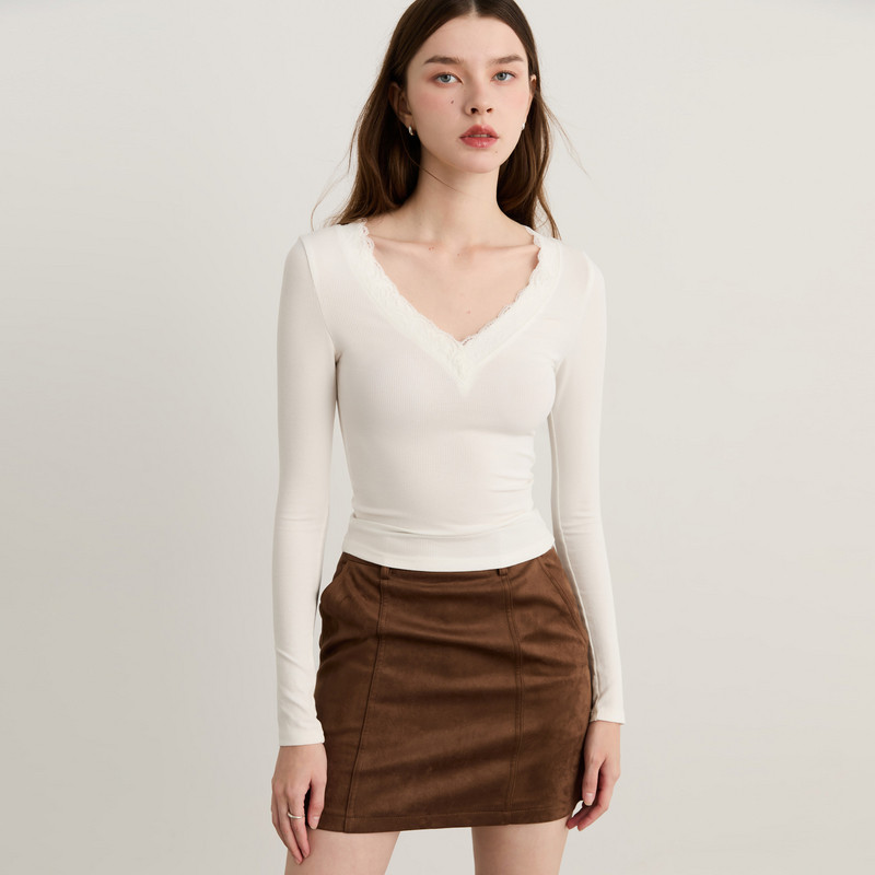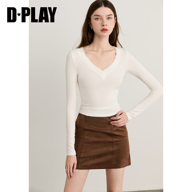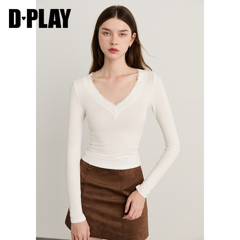 DPLAY【惠品】白色T恤衫女V领法式春季新款蕾丝气质打底衫上衣
