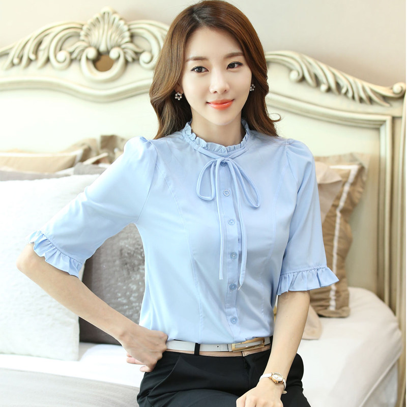 2023夏季新款韩范女装短袖雪纺衬衫女小清新学院风系带蝴蝶结衬衣