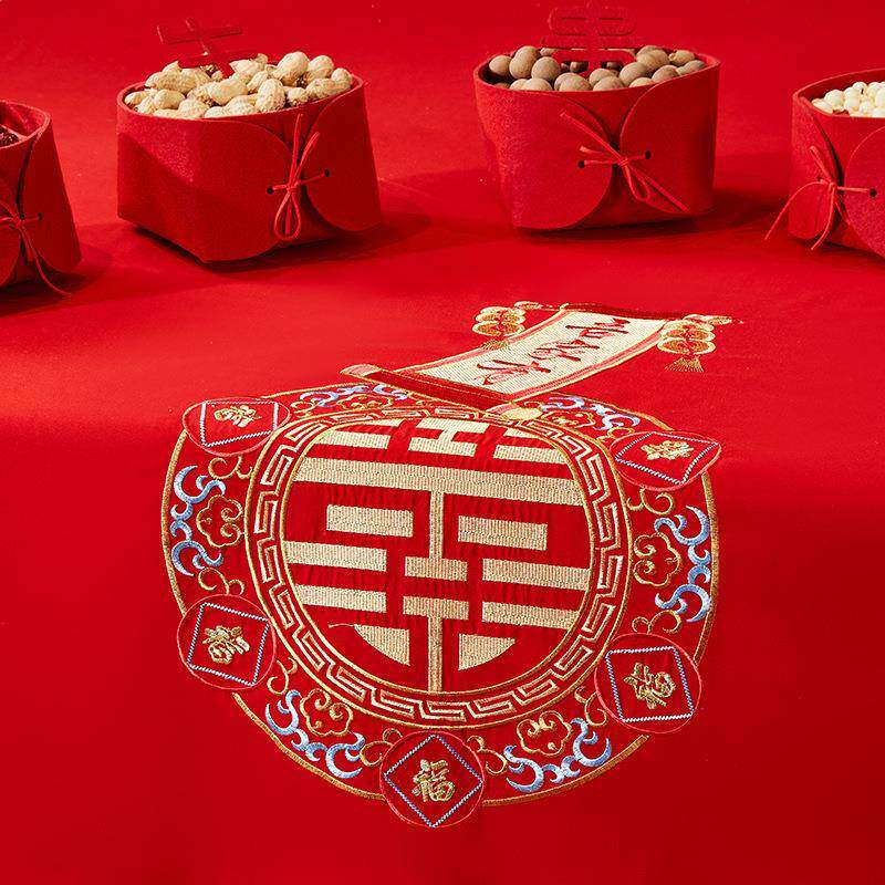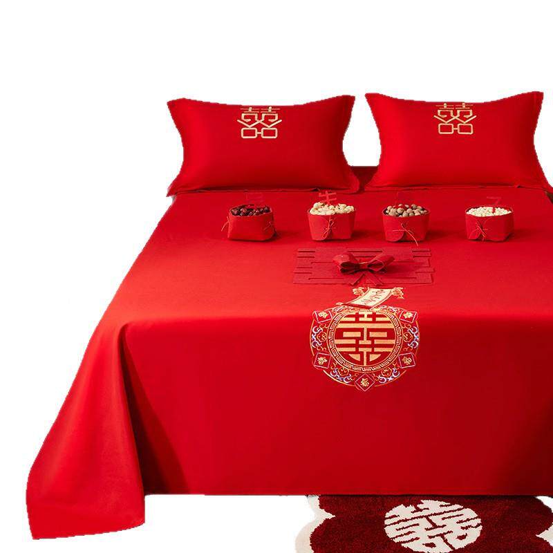 大红色婚庆婚床单单件结20240711喜被单庆用枕套三件套喜字刺绣酒