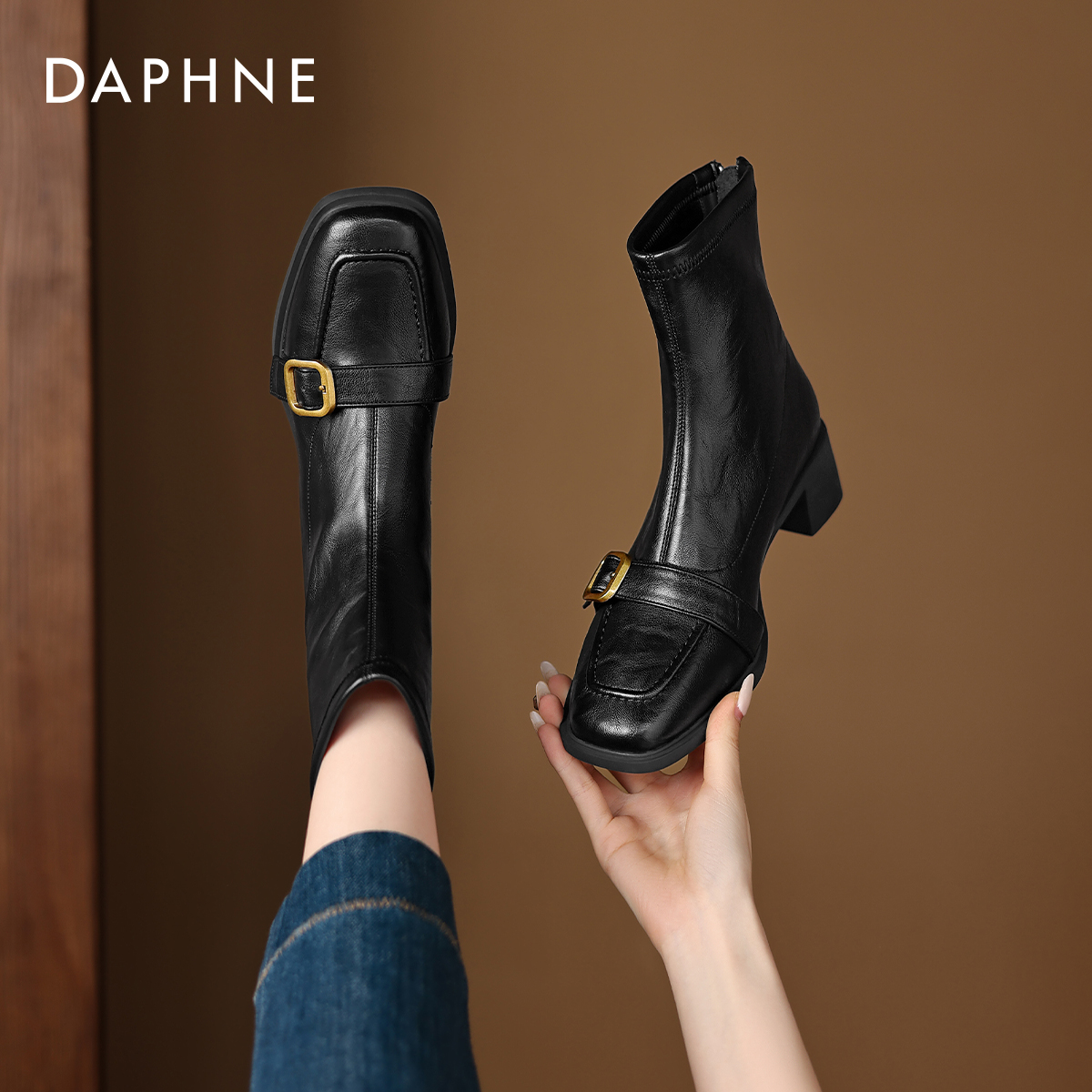 达芙妮方头黑色瘦瘦小短靴2025新款秋冬季女款女士皮靴子马丁女靴