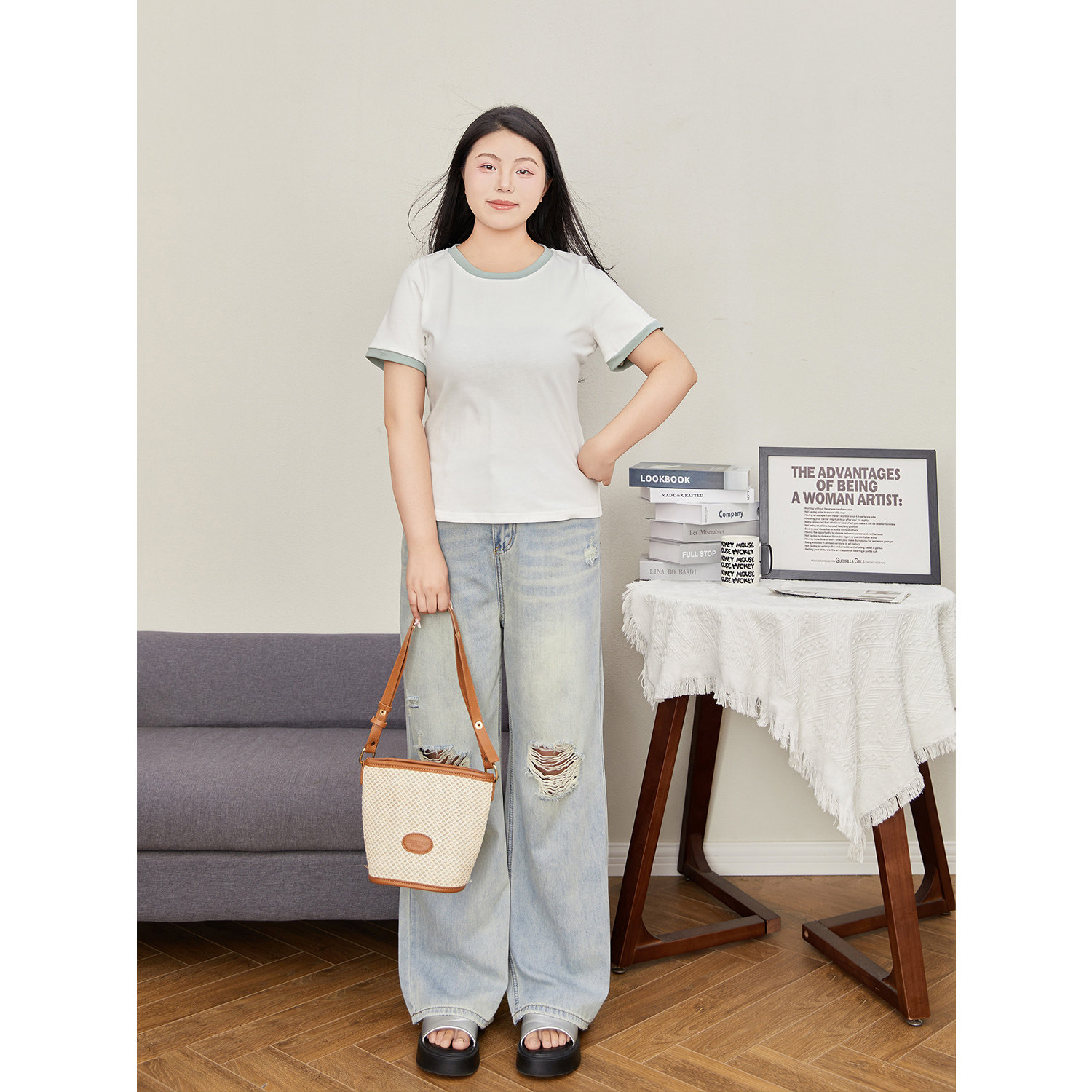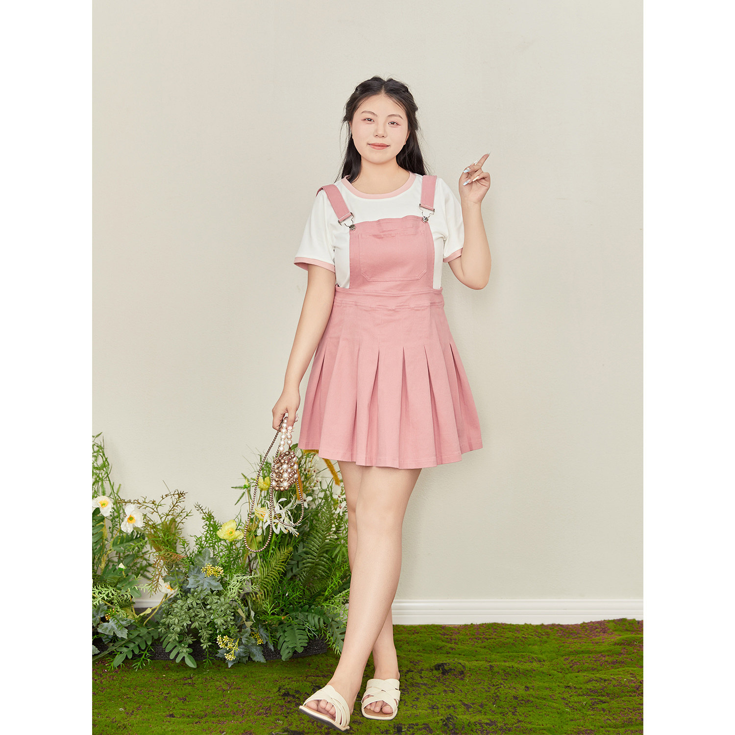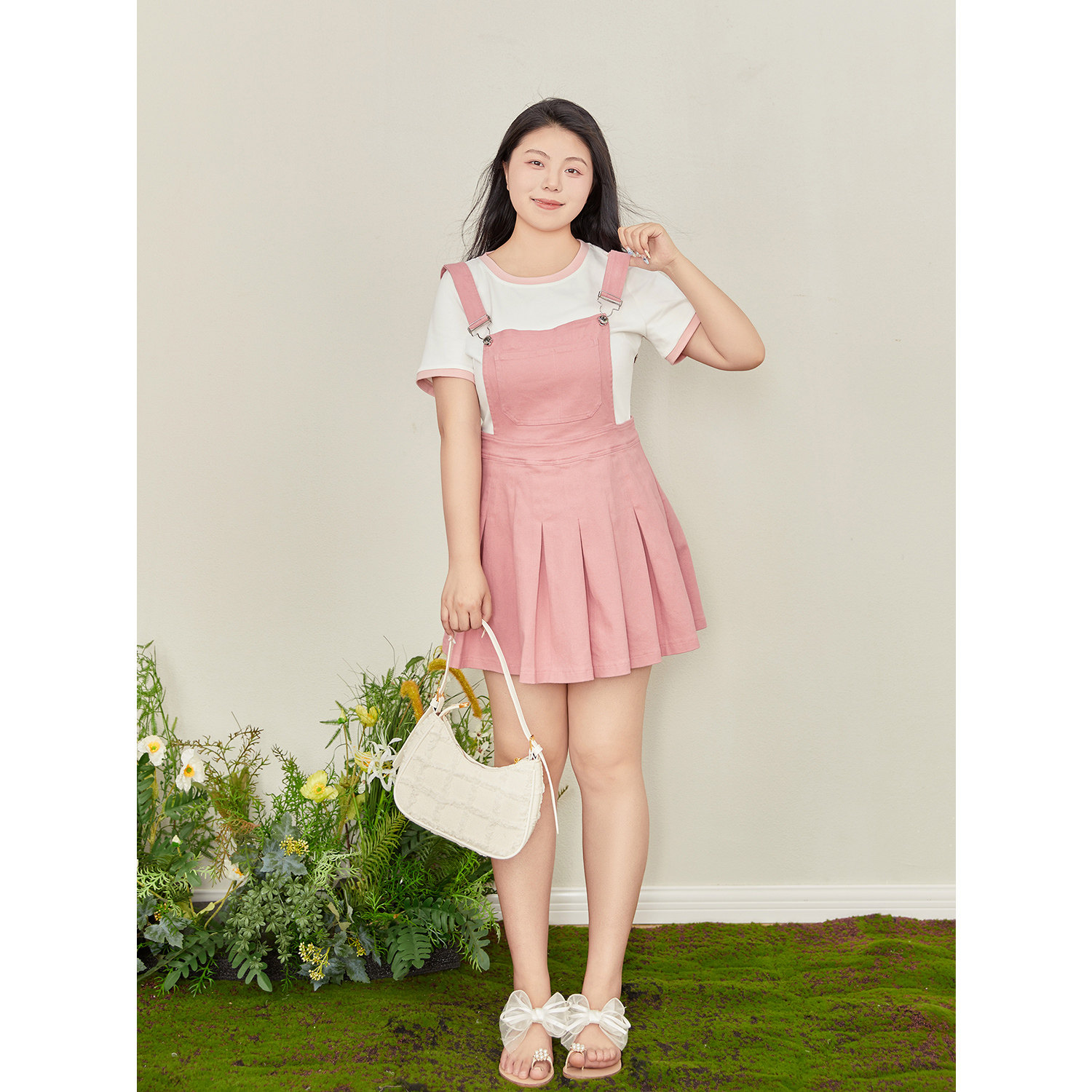 DM100大码女装一加一版型夏微胖mm【牛仔背带裙】正肩撞色T恤套装