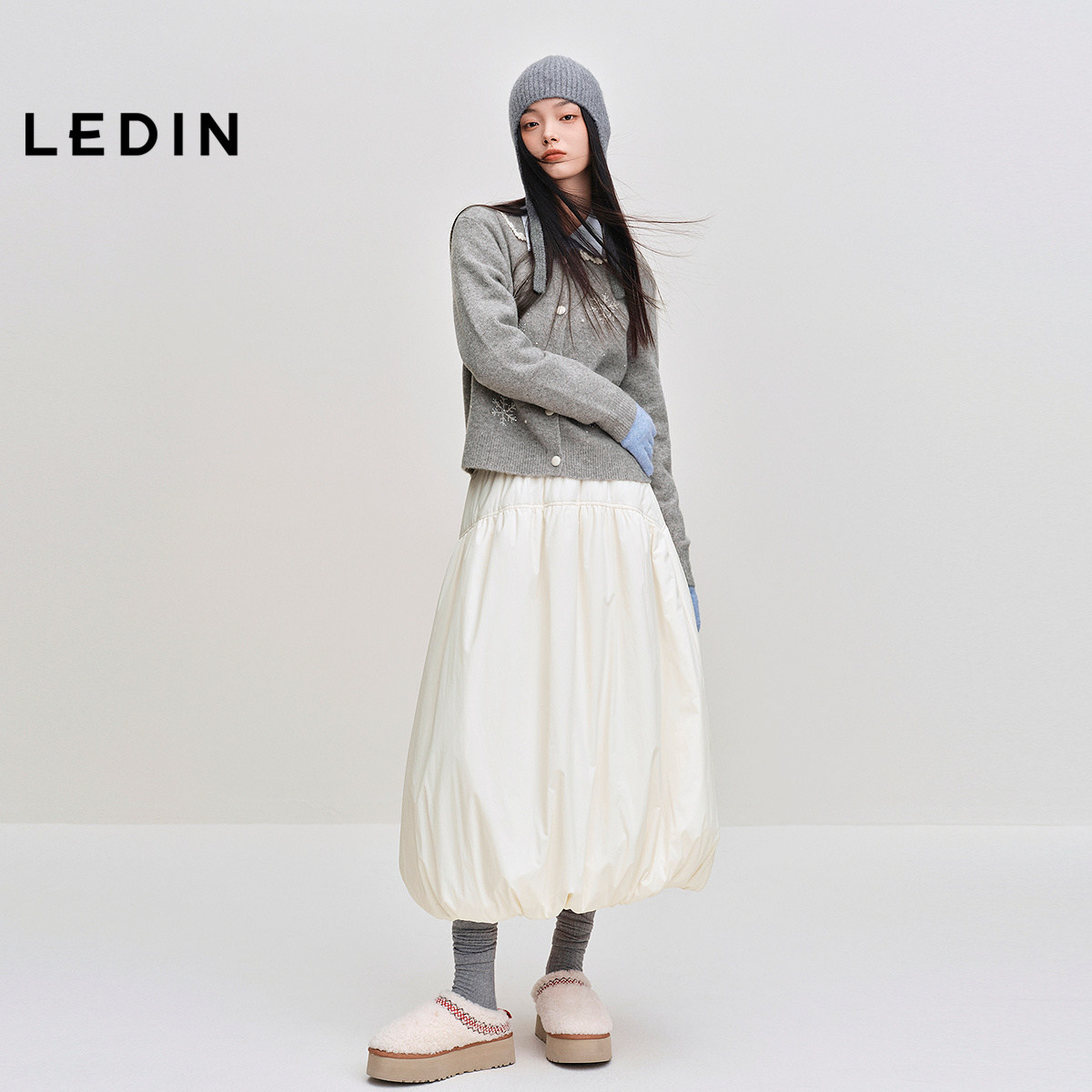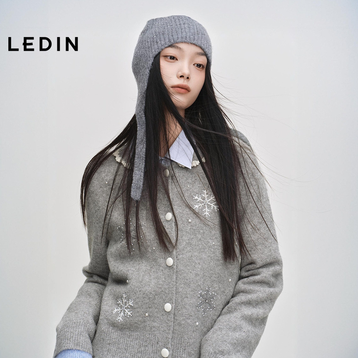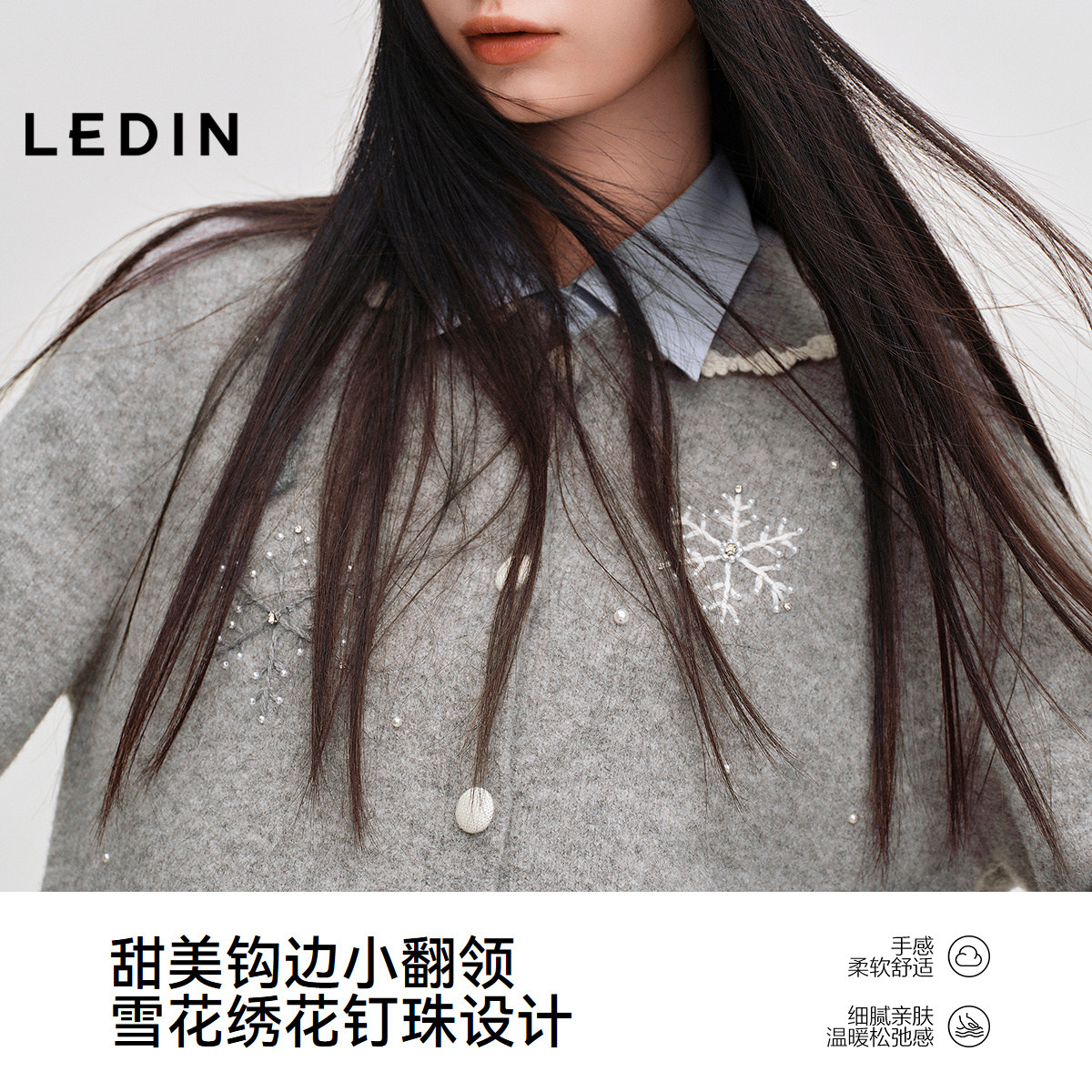 乐町甜美花边翻领毛衣开衫冬季新款雪花绣花软糯正肩内搭灰色上衣