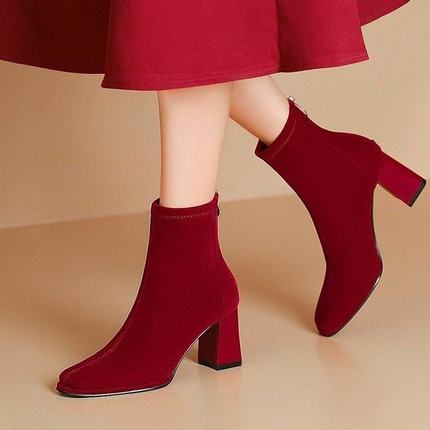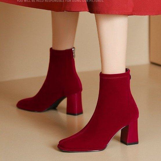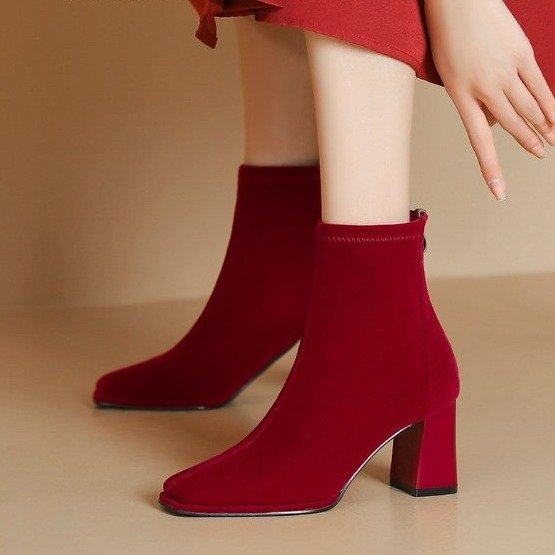 磨砂厚底加绒冬季短靴粗跟2025新款中式结婚鞋秀禾新娘鞋红色短靴
