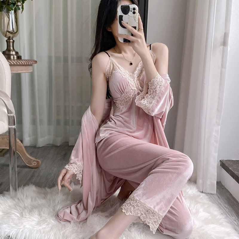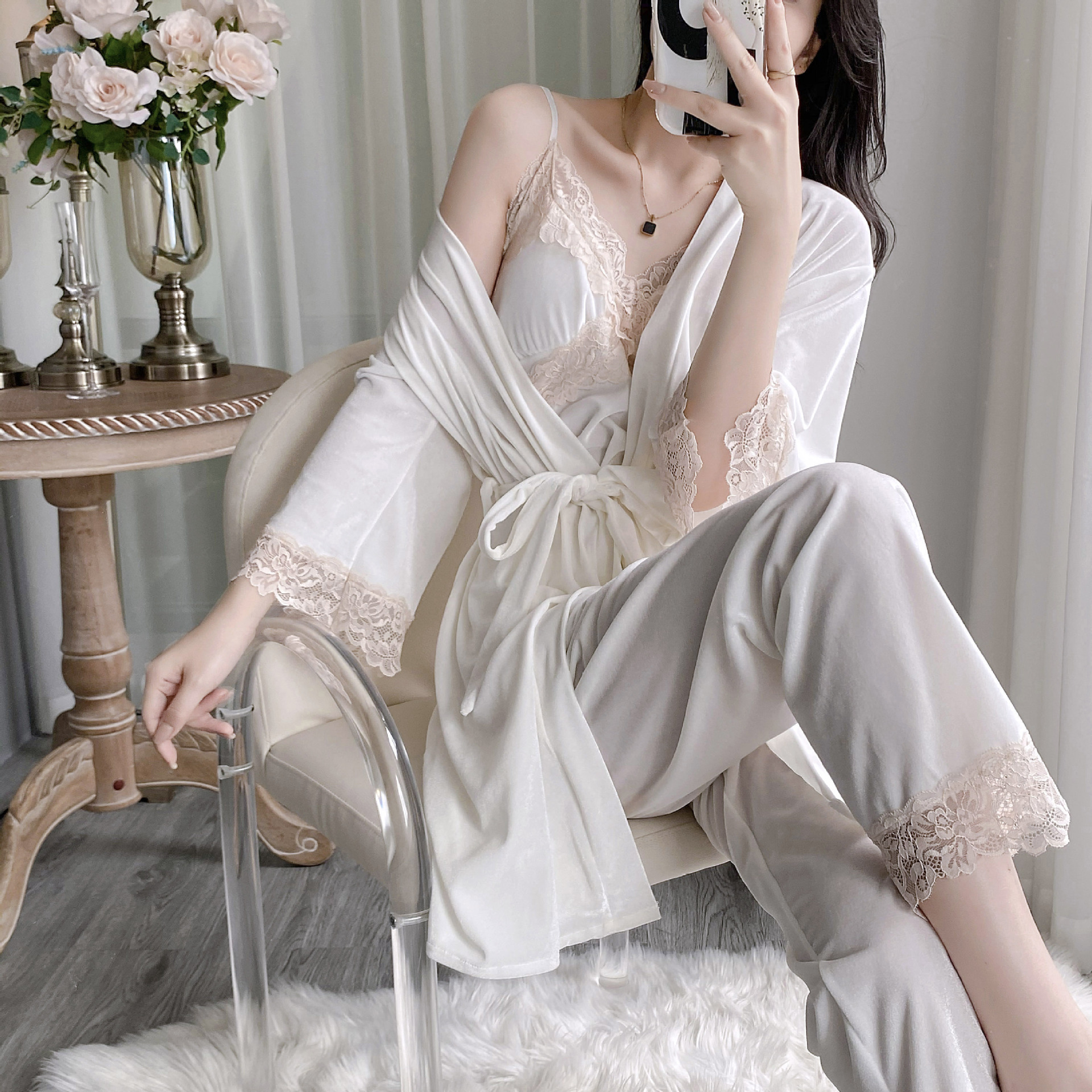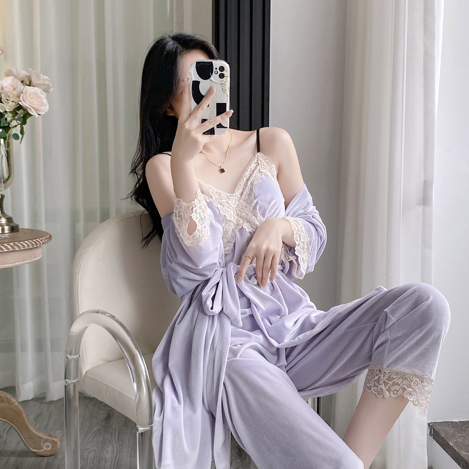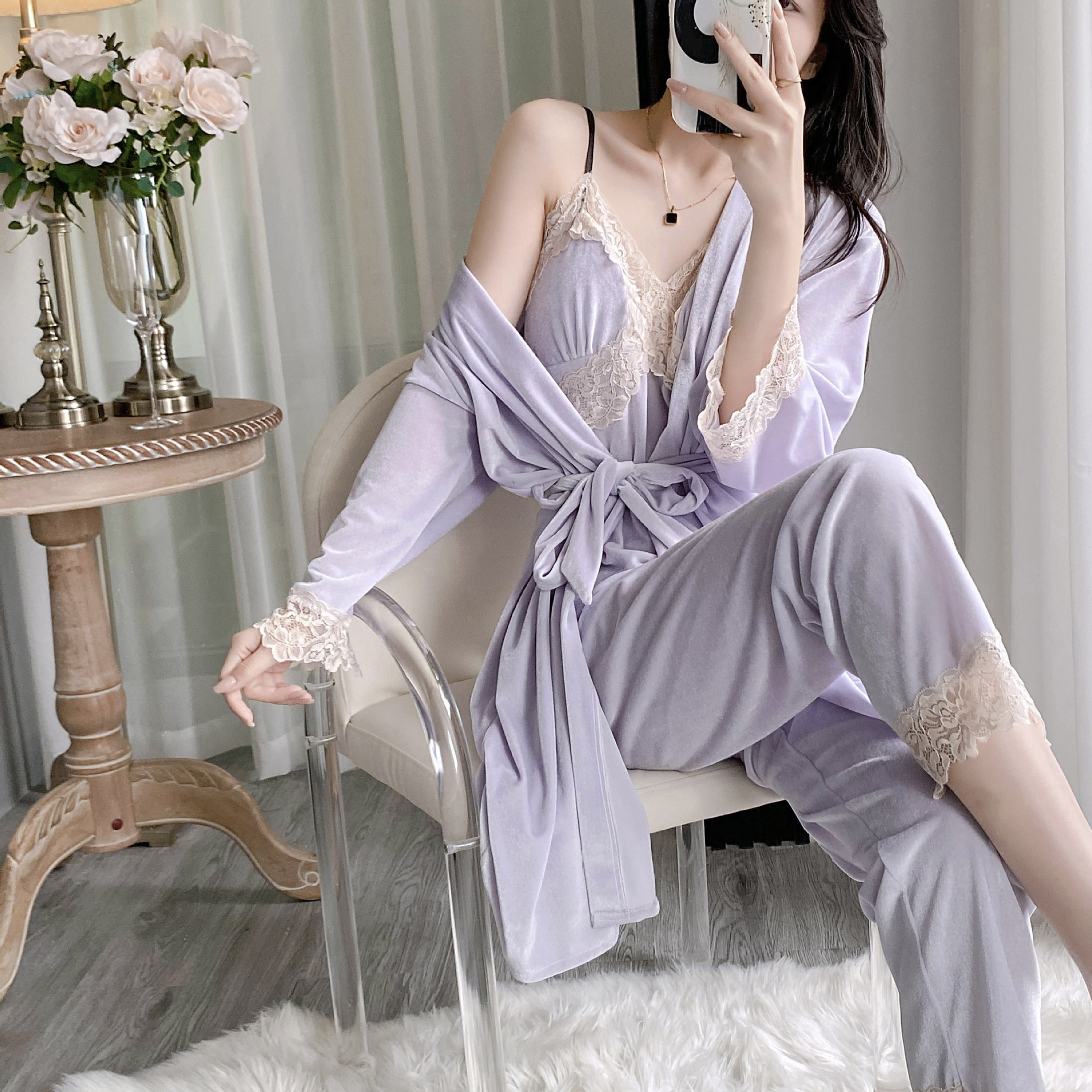 金丝绒性感睡衣女2025新款春秋三件套高级感吊带长裤居家服可外穿